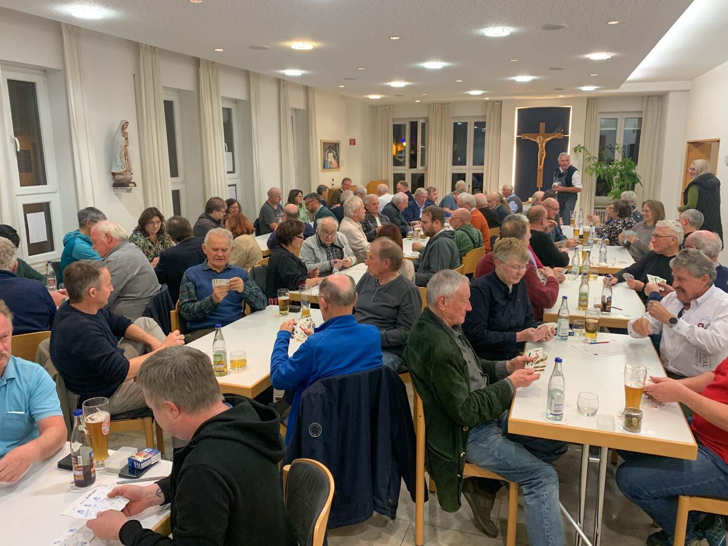 Pfarrer Herbert Kohler freut sich: Es ist schon das 5. Turnier, die Teilnahme prima. Der Pfarrsaal Hl. Geist ist mit 16 Tischen voll. Die Schafkopffreunde Neuburg erinnern an die Spielregeln: Solo, Wenz ab drei, … Tout anmelden, kein Kontra, …