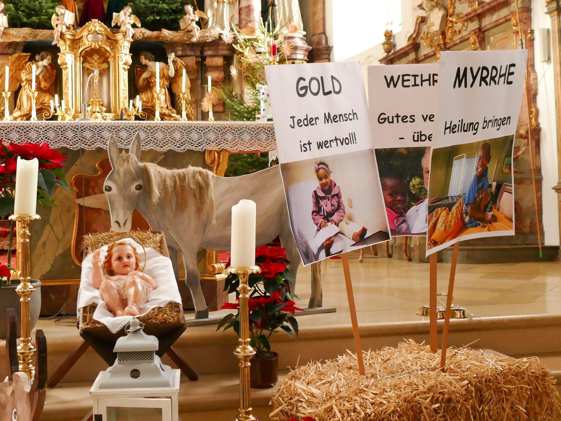 Gold als Symbol: „Jeder Mensch ist wertvoll“, Weihrauch als Erinnerung: „Gutes verbreiten – überall“ und Myrrhe als Zeichen: „Heilung bringen“. So haben es die Kinder und Jugendlichen in der Pfarrei auf Plakaten formuliert und dazu Fotos präsentiert, die ganz konkret zeigen, wo die Erlöse aus der Sternsingeraktion zum Einsatz kamen und kommen.