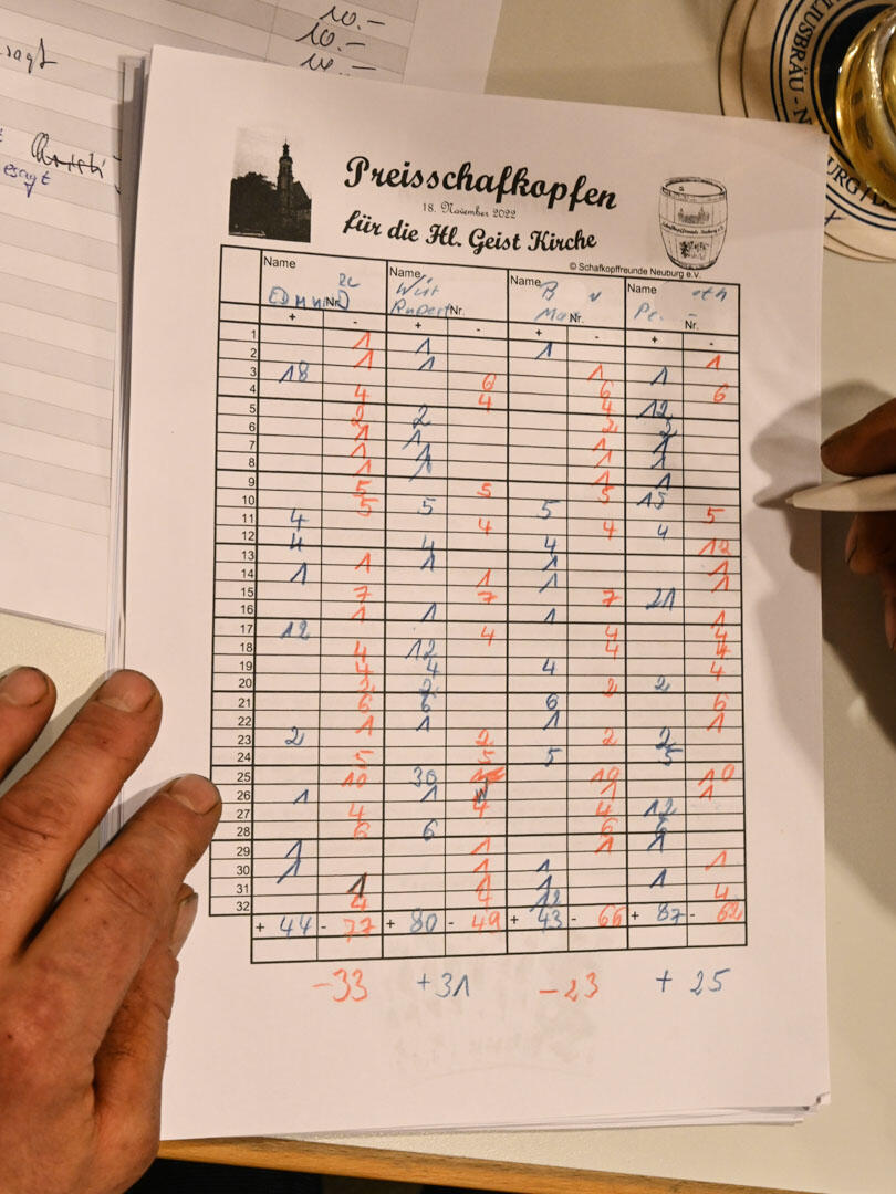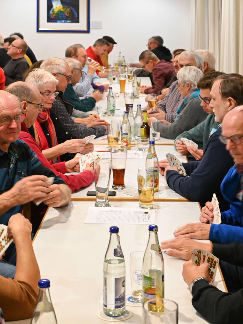 Die Serviceleute eilen unauffällig durch die engen Reihen, stellen große und kleine Gläser auf die Tische ("Aufschreiben bitte selber!"). Die 1. Runde geht zuende und die Brotzeit ist auch schon da. Entspannung, Stärkung, Fachgespräche. "Mei, hab i a schlechts Blatt kabbt", war oft zu hören
