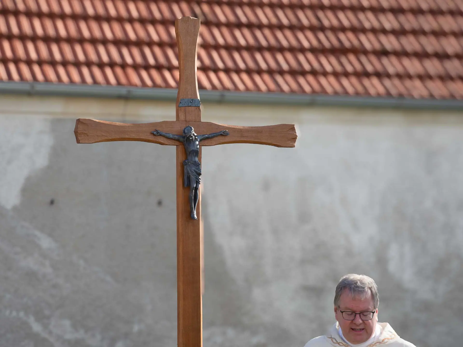 Nach dem Gottesdienst wurde ein neues Kreuz hinter der Kirche gesegnet, das an zwei gegen Kriegsende gefallene Soldaten erinnert, die neben der Kirche bestattet wurden. Schreinermeister Göbel aus Hütting hatte das sehr schöne Kreuz angefertigt und gestiftet.