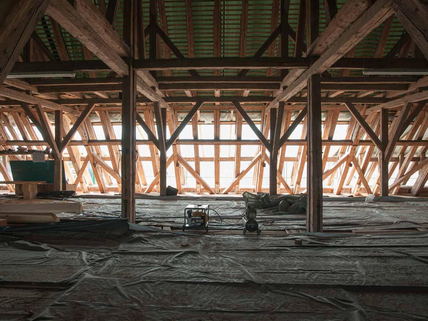 (Wolfgang Böhm) Wir waren ja richtig neugierig. Und wir haben uns gewundert, was da schon alles geschehen ist. Die Sparrenfüße und die Deckenbalken waren einst eingemauert. Sie wurden und werden saniert. Das ist richtige Knochenarbeit, oft genug bei sommerlichen Temperaturen.
