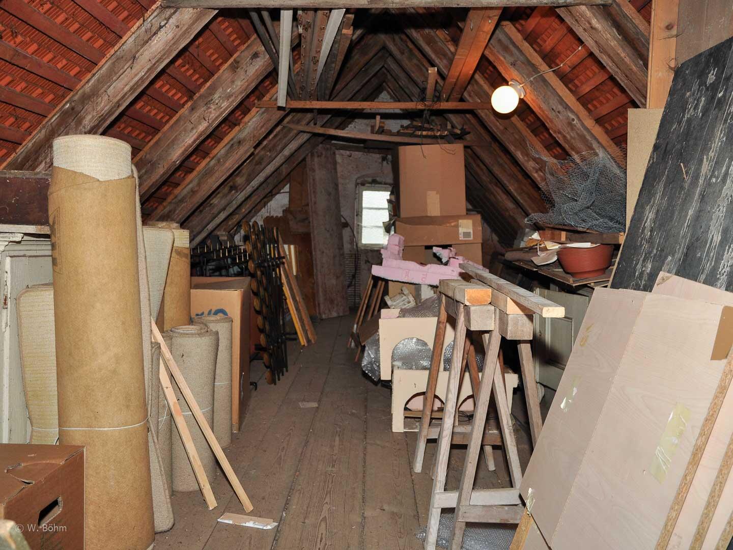 (Wolfgang Böhm) Wir haben vor und während der Sanierung unserer Kirche jede Menge entsorgt. Der Dachboden über der Sakristei diente als Lager. Drei Treppenstufen mit ganz schmalen Tritten neben dem Aufgang zum Turm führen in den Dachspitz. Er darf nach der Sanierung nicht mehr genutzt werden.