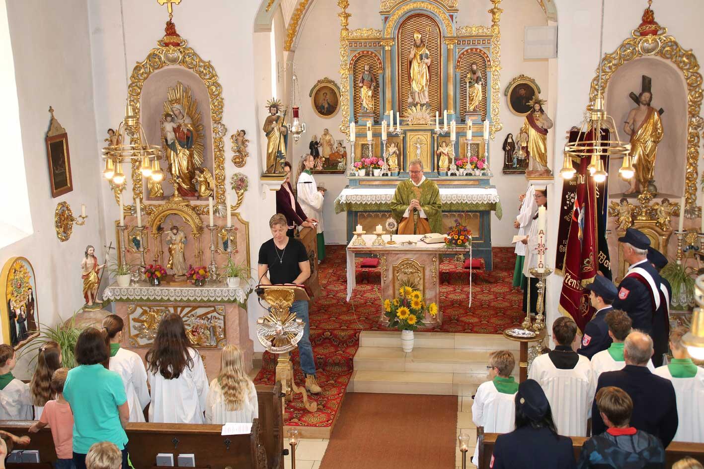 Pfarrer Herbert Kohler eröffnete das Dorffest mit einem festlichen Gottesdienst in der Kirche. Zahlreiche Gottesdienstbesucher waren gekommen und so zog unsere Fahne der Feuerwehr mit Fahnenabordnung, den Ministranten und Pfarrer Kohler in die Kirche ein.