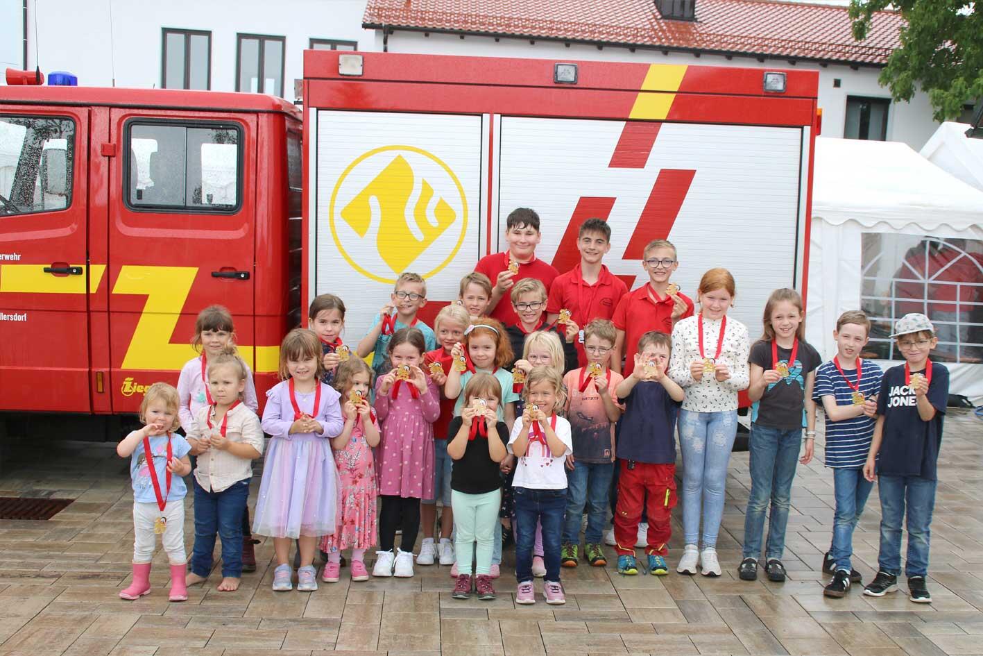 Nach dem Gottesdienst ging es zum gemütlichen Teil über. Braten, Gemüsepfanne, Kaffee und Kuchen standen bereit. Für die Kinder gab es wieder viele Spiele. Aufgrund des regnerischen Wetters wurden einige Spiele in das Martinsheim verlegt. Am Ende waren alle Kinder Sieger und wurden mit einer Feuerwehr-Medaille ausgezeichnet.