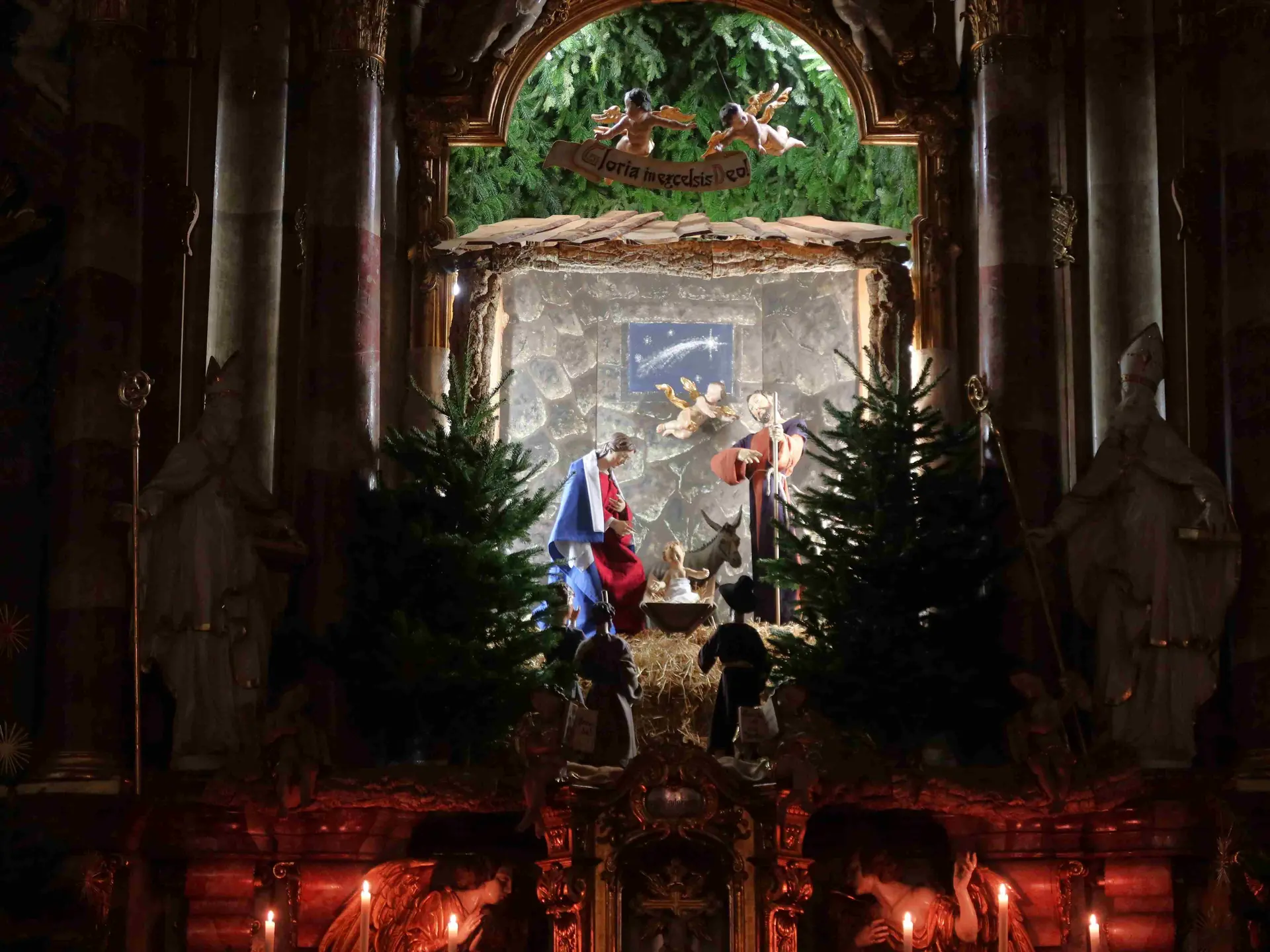 (Christine Jann) Auch zur späten Stunden an Heiligabend war die Hl. Geist – Kirche gut gefüllt. Stadtpfarrer Herbert Kohler lud in seiner Begrüßung dazu ein, sich vom Kind in der Krippe berühren zu lassen. Dabei könne jeder gerne alles mitbringen, was ihn gerade bewege: Freude, Dankbarkeit, Erfolge genauso wie Schmerz, Trauer oder Misserfolge. Die kleine Krippe sei groß genug für alles, was zu unserem Leben gehöre.