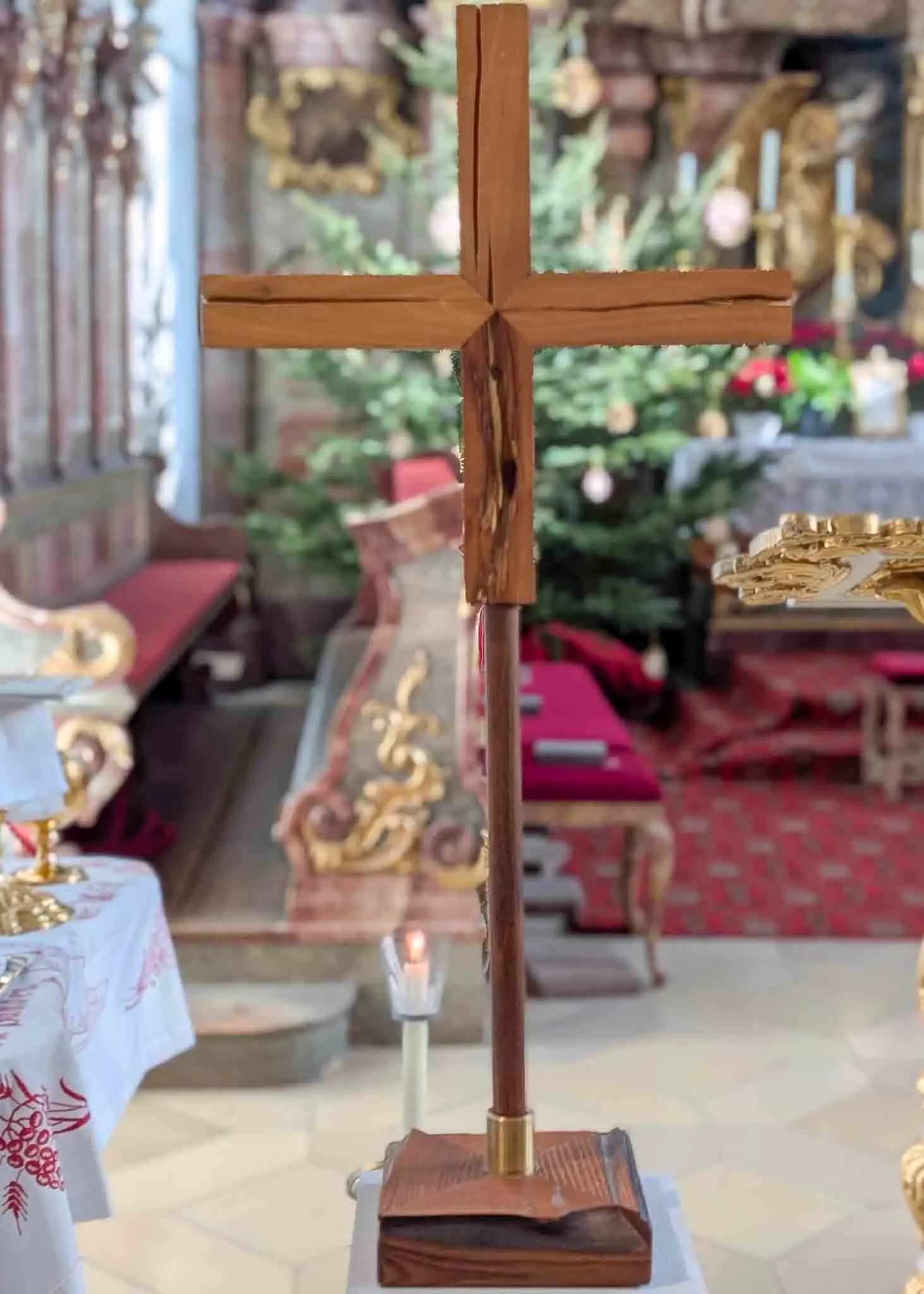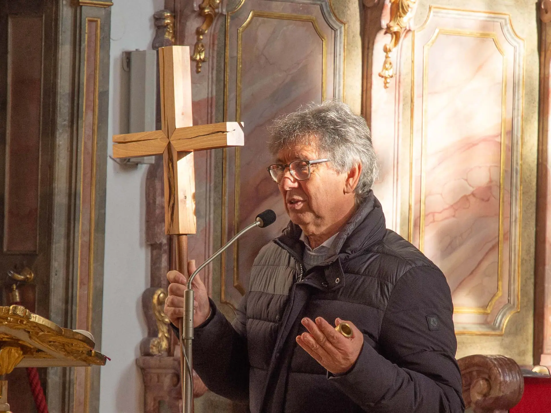 In seiner ruhigen und bedächtigen Art erzählte der Handwerker und Künstler Knöferl zu Beginn des Gottesdienstes von den Problemen, die ihm ein kleines Kreuz machte, das in seiner Halterung einfach nicht geradestehen wollte. Dabei sei es am Ende eine winzige, fast nicht sichtbare Kleinigkeit gewesen, die es dann ins Lot brachte. Dieses Ausrichten, selbst ausgerichtet zu sein, sei aber so wichtig für Menschen. Für ihn sei immer das Kreuz der Fixpunkt, an der er sich und sein Leben ausrichte. Mit der Aufforderung, zum Einstieg in den Gottesdienst noch einmal ganz bewusst das Kreuzzeichen zu machen, lud er die Kirchenbesucher ein, es ihm darin gleich zu tun.