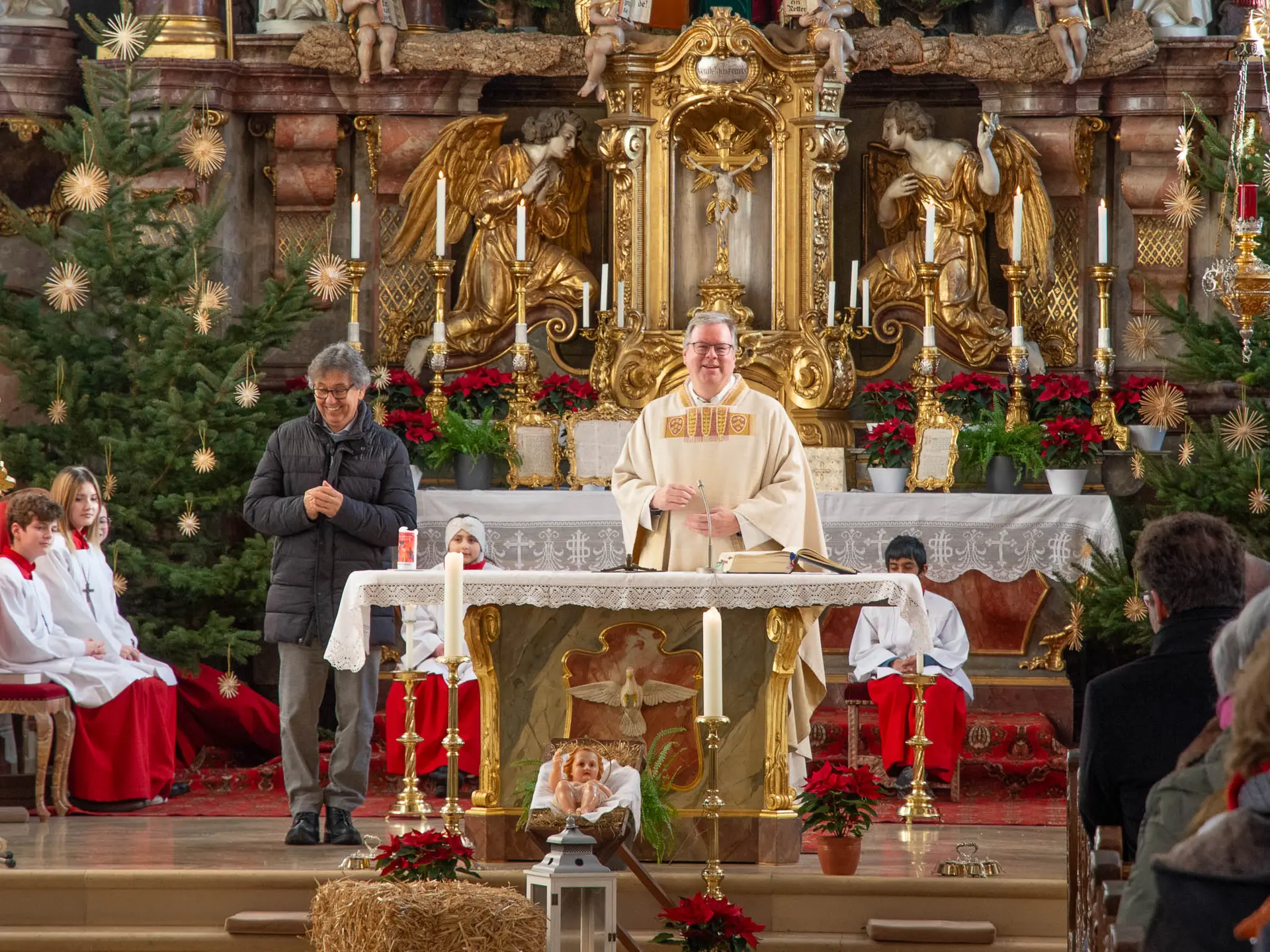 (Christine Jann) Der Start ins Jubiläumsjahr am vergangenen Sonntag, 11. Januar setzte mehrere Ausrufezeichen: Der Chor Windrose sorgte stimmgewaltig mit Weihnachtsliedern aus aller Welt für eine schwungvolle musikalische Gestaltung. Max Höringer, langjähriger Organist von Hl. Geist, begleitete die Lieder für den Gemeindegesang. Ja, und dann war da Martin Knöferl, der vor etwa 40 Jahren als Gemeindereferent in der Pfarrei tätig war. Jetzt kehrte er als Leiter der Abteilung Supervision und bekannter Künstler in „seine“ Hl. Geist – Kirche zurück und stimmte die Gemeinde geistlich ein.