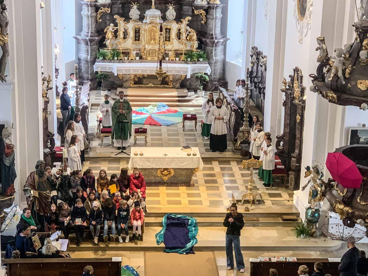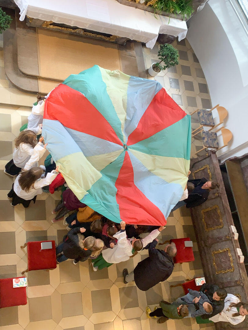 Diese Zusage durften die Kinder dann beim Friedensgruß spüren, in dem sie sich unter ein großes Schwungtuch stellen durften.