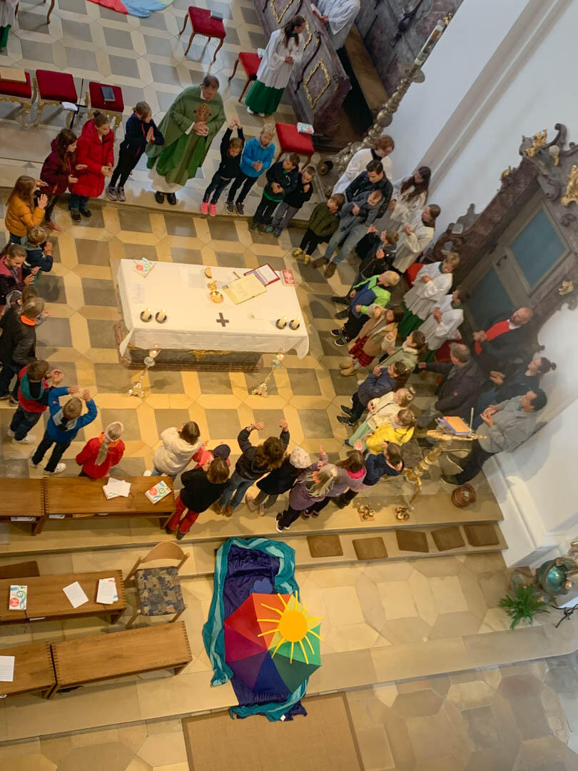 Überall in der Kirche hingen aufgespannte Schirme und verliehen dem Kirchenraum ein buntes und lebendiges Bild. In der Feier, die wie immer stimmungsvoll durch unseren Kinderchor und die immer weiter wachsende Band gestaltet wurde, ging es dann darum, wann wir uns "beschirmt" fühlen.