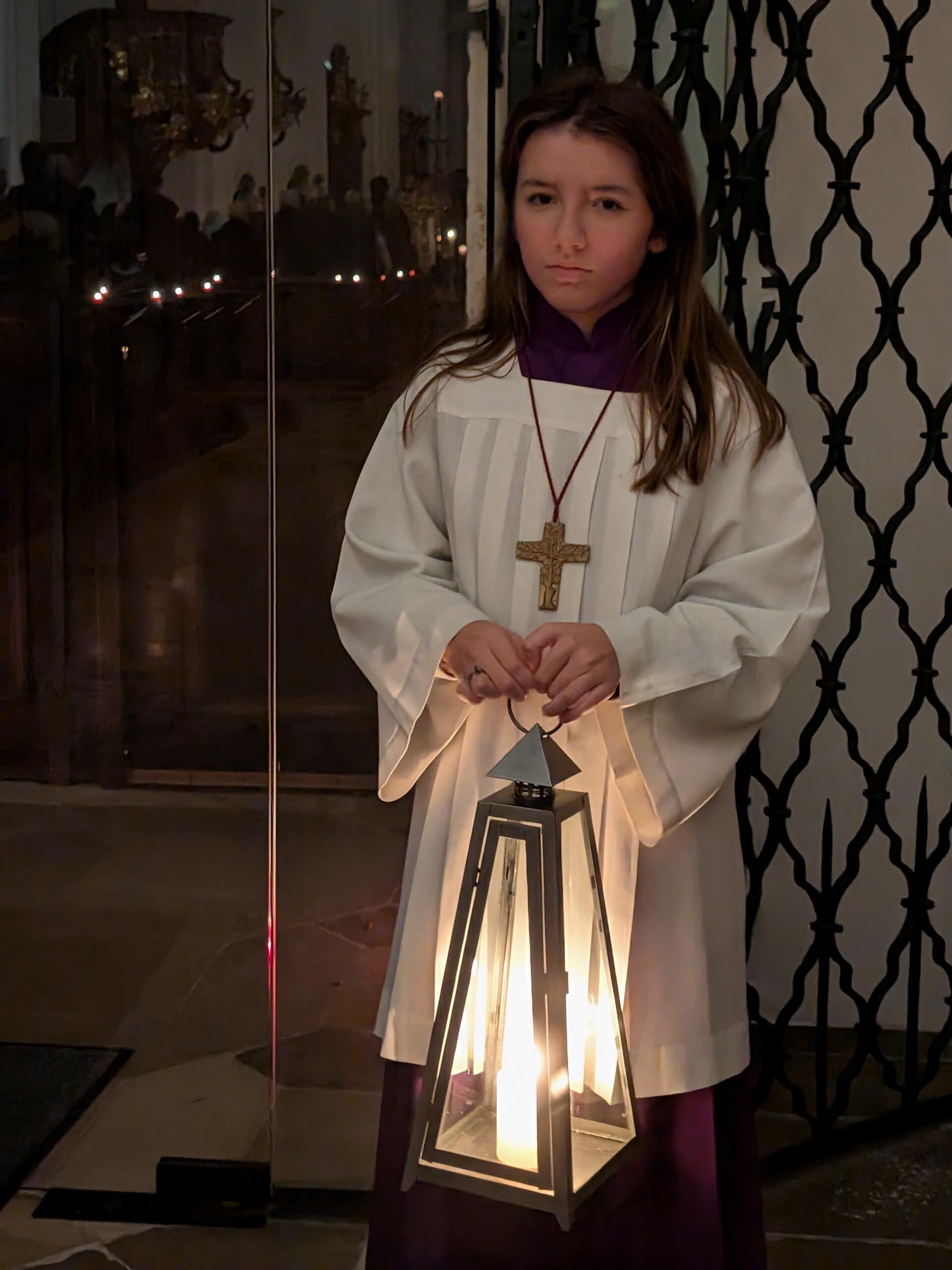 Und in die Stille des Gotteshauses brachten zu Beginn der Messe zwei Ministrantinnen das Friedenslicht aus Bethlehem. In der Grabeskirche entzündet wird es in ganz Europa verbreitet. Die dazu vorgetragenen „Gedanken einer Kerze“ bringen den damit verbundenen Gedanken gut auf den Punkt: