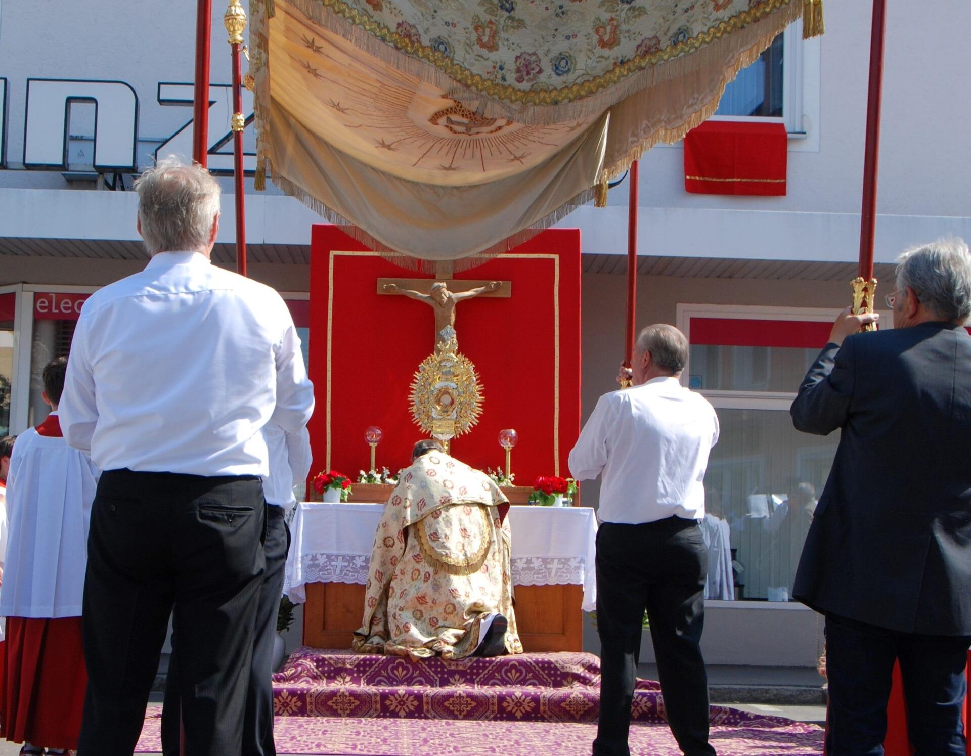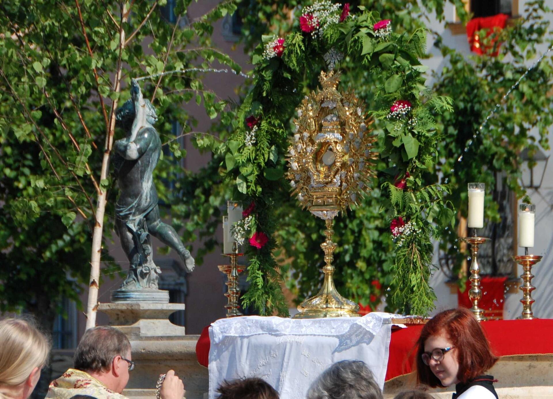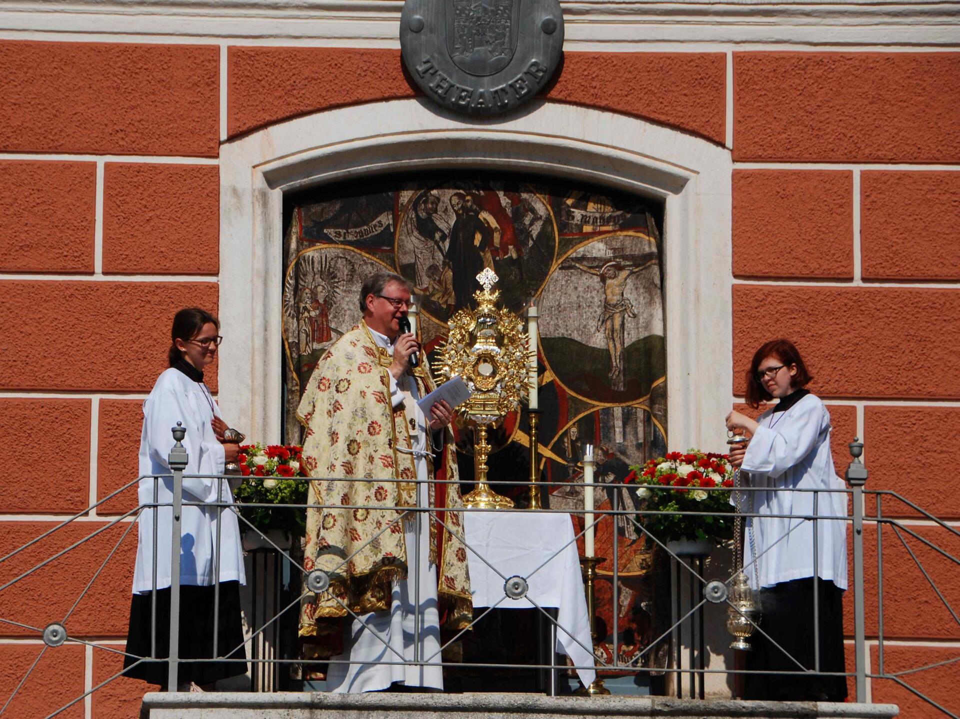 Wie in den letzten Jahren waren an der Mariensäule am Karlsplatz, am Theater, in der unteren Stadt und vor der Hl. Geist Kirche Altäre aufgebaut. An den einzelnen Stationen nutzte Kohler die besonderen Örtlichkeiten, um entsprechende Anliegen zu formulieren, bevor er nach Lesung und Fürbitten mit der Monstranz jeweils den sakramentalen Segen in alle Himmelsrichtungen erteilte.