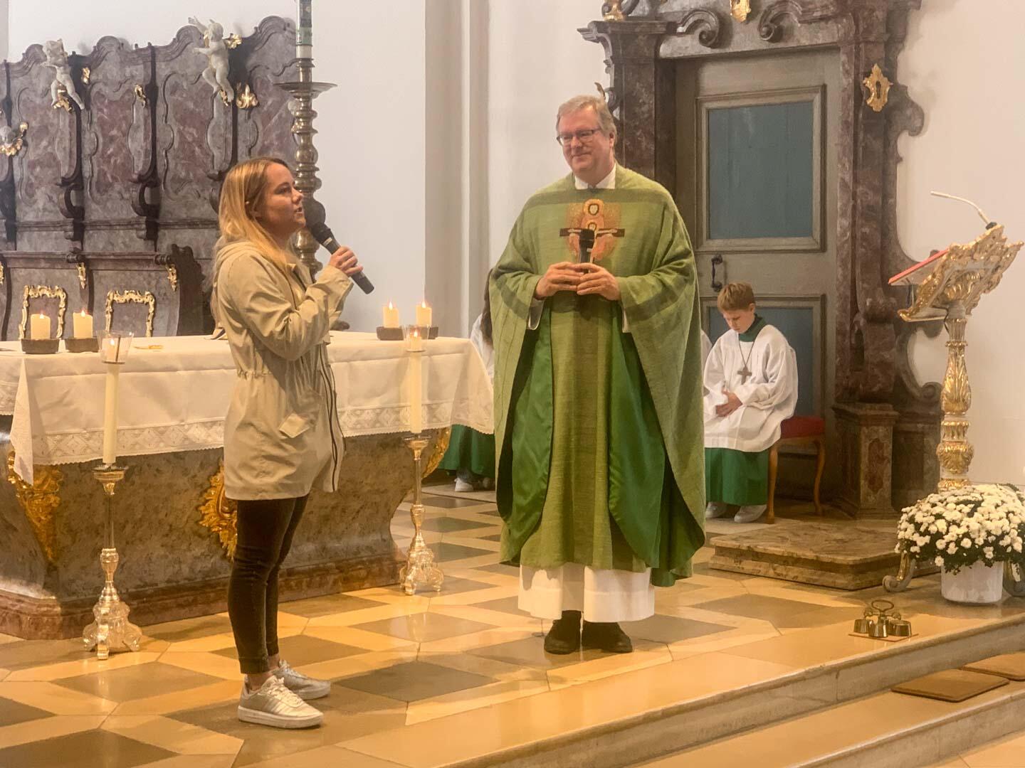 In der Hl. Messe am Sonntag, 29. September in der St. Peter Kirche stellte Pfarrer Herbert Kohler die frisch ausgesandte Gemeindereferentin vor. Nachdem wir vor zwei Jahren mit Pauken und Trompeten eine Primiz gefeiert haben, solle der Start von Moni in ihr Berufsleben nicht spurlos an der Gemeinde vorübergehen, stellte Pfarrer Kohler klar.