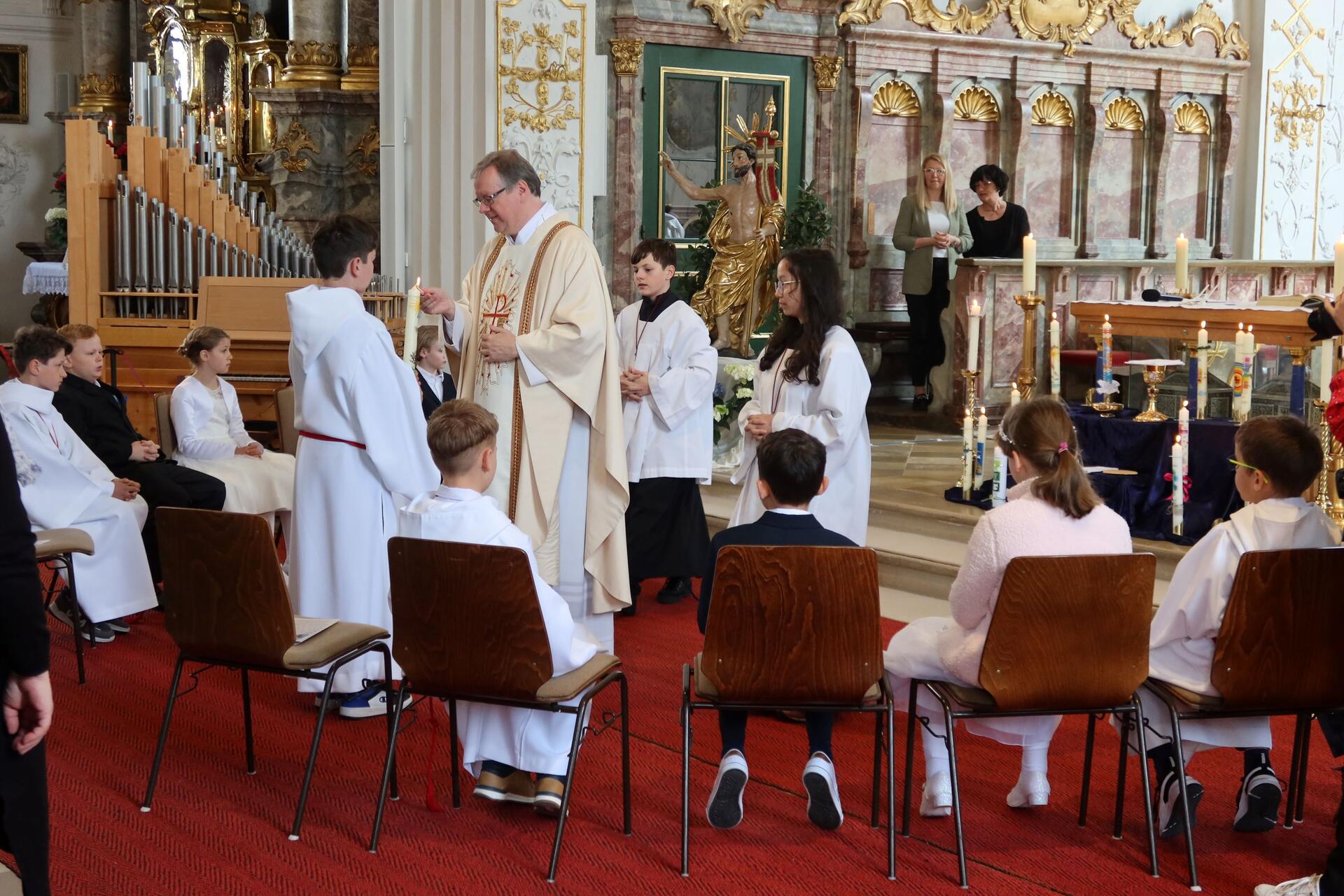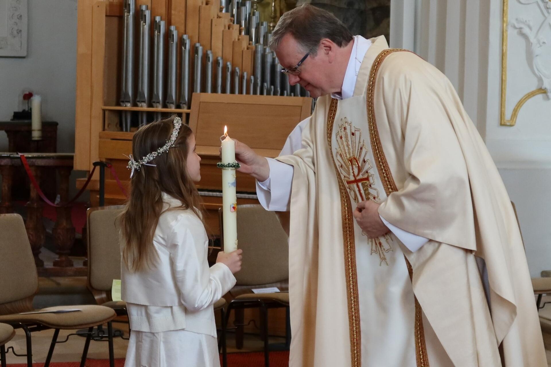 Angeführt von den Ministranten und in Begleitung von Pfarrer Kohler zogen 14 Erstkommunionkinder mit ihren schön verzierten Kerzen in die Hofkirche ein, die von Eltern, Geschwistern, Verwandten und Freunden sehr gut gefüllt wurde. Nach der feierlichen Entzündung der Kommunionkerzen mit dem Licht der Osterkerze durften die Kommunionkinder im Halbkreis vor dem Altarraum Platz nehmen.