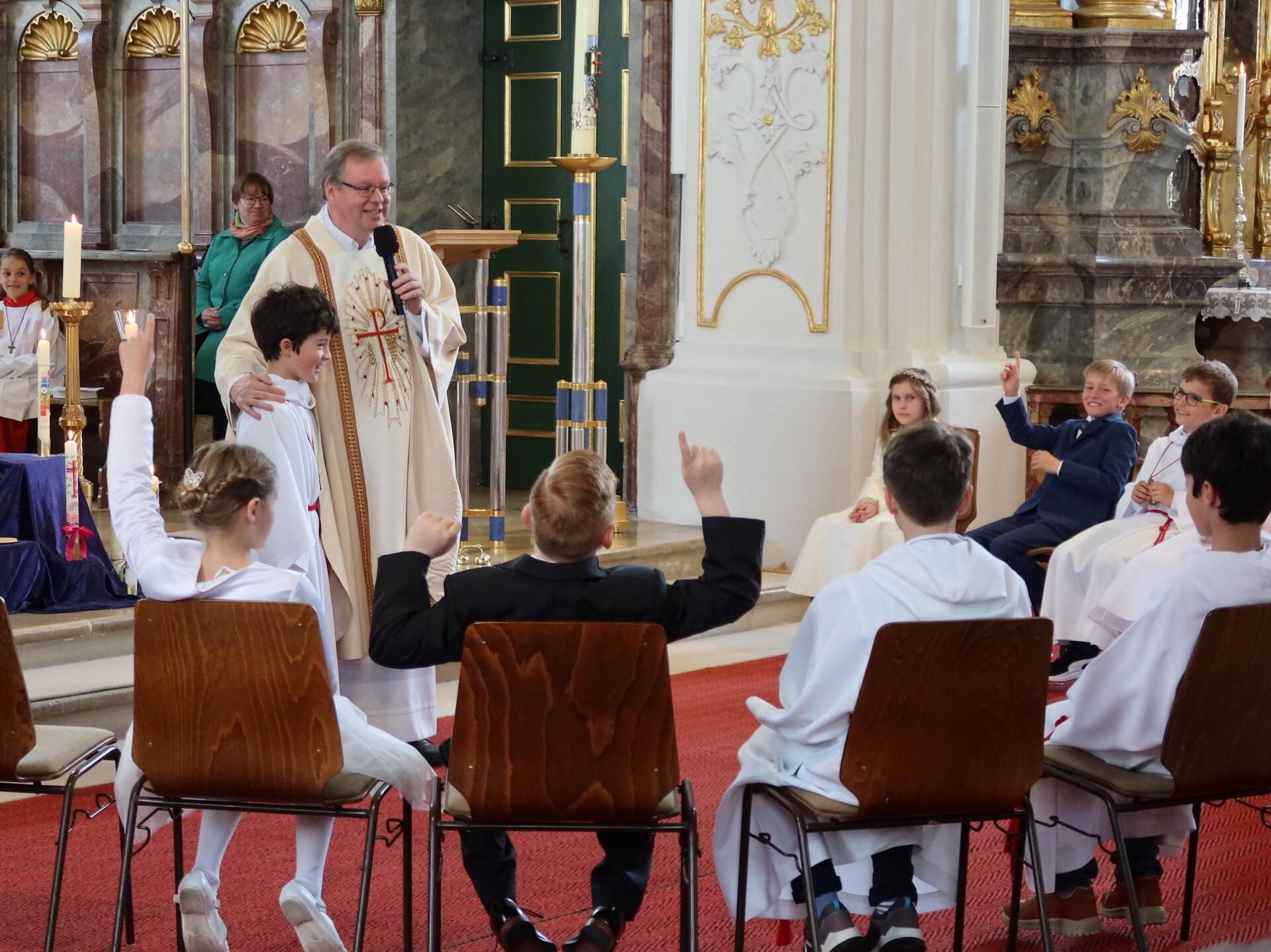 Von Anfang an band der Stadtpfarrer die Kinder in den Ablauf der Liturgie mit ein und erklärte immer wieder das Geschehen. Die wiederum waren engagiert dabei und hatten ihre Freude, die Fragen zu beantworten oder die Gaben zum Altar zu bringen. Die Kommunionvorbereitung unter der Leitung von Gemeindereferentin Anne Strahl war offensichtlich gut angekommen und sehr gelungen.