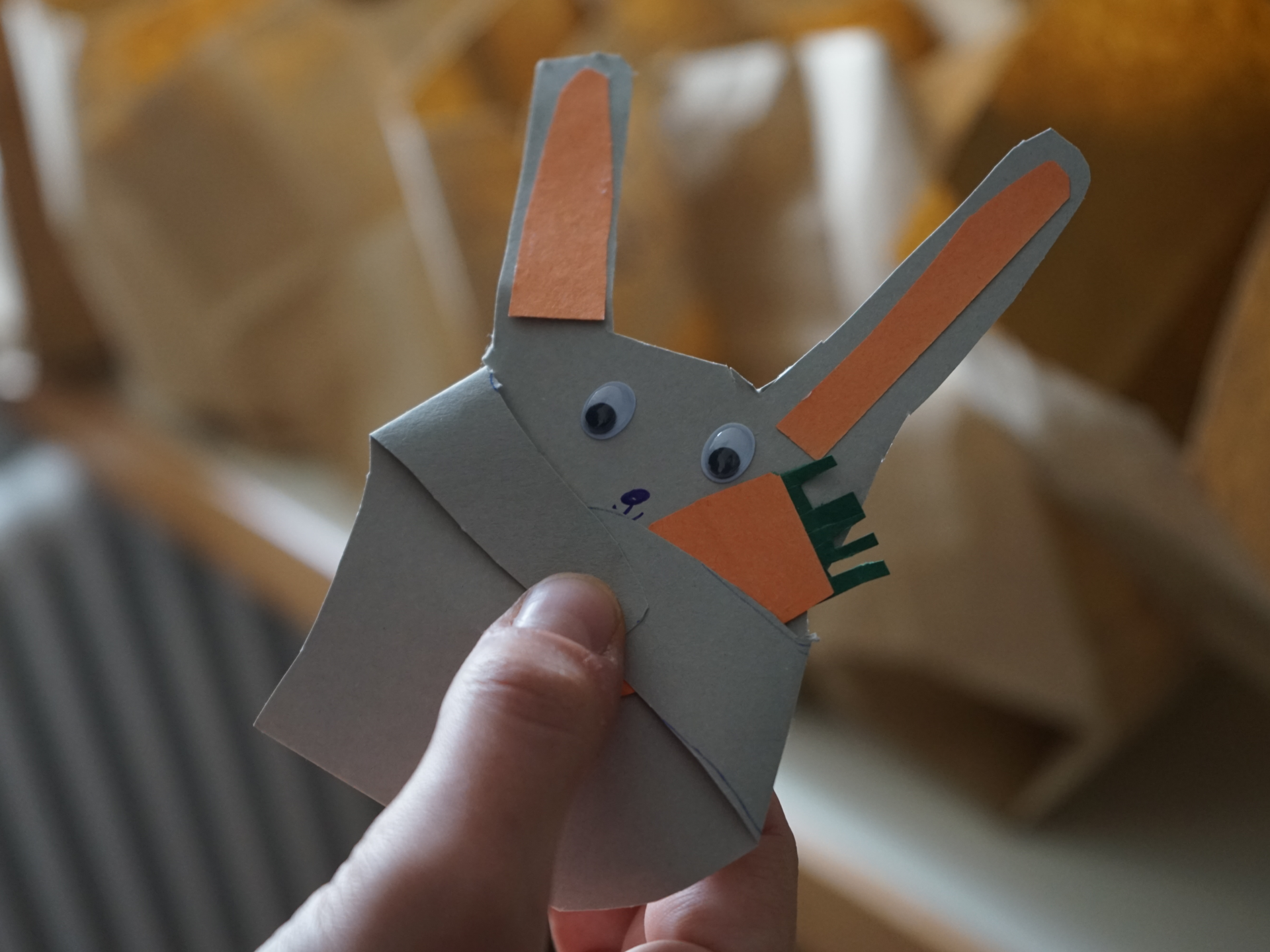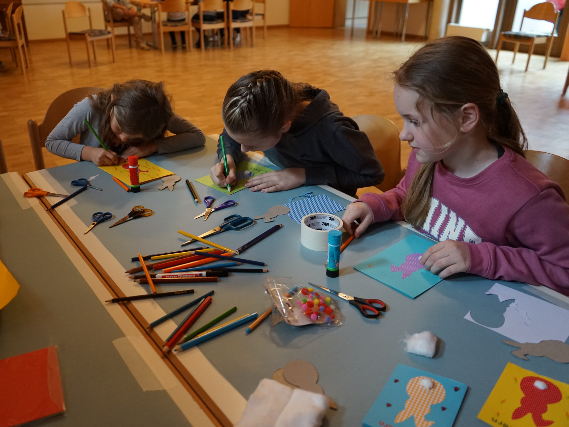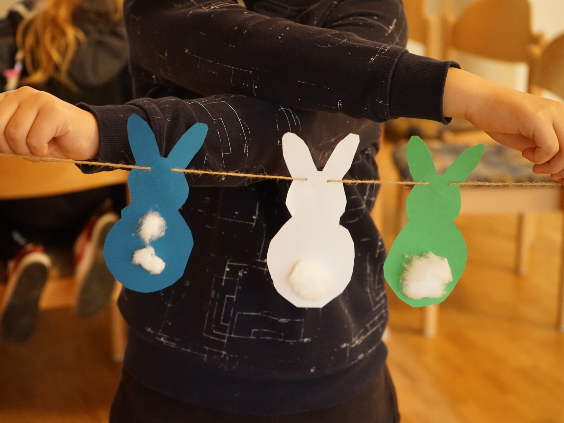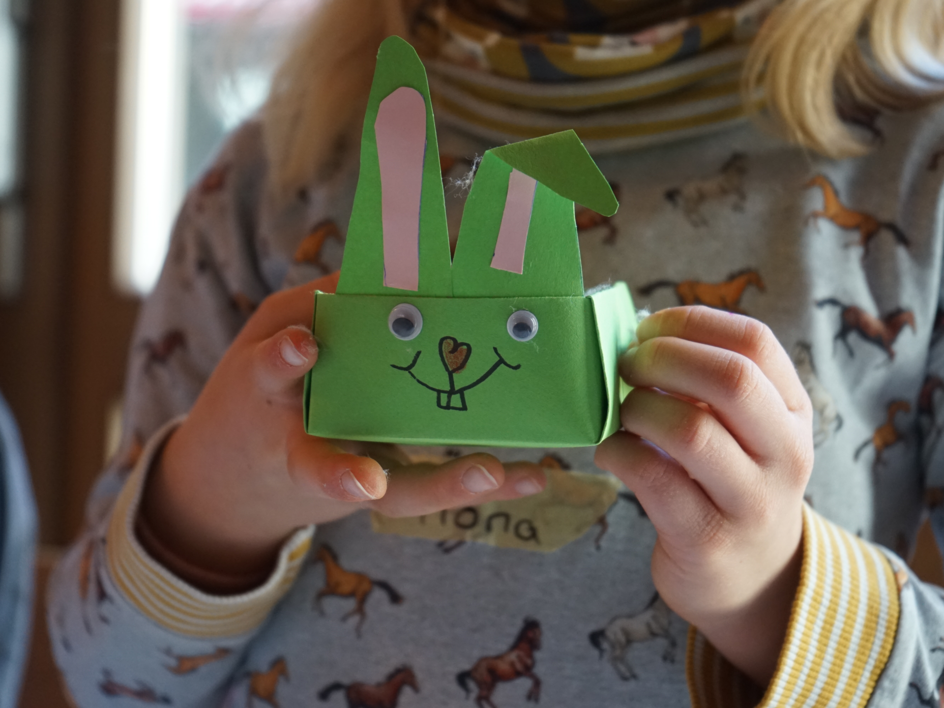 Gestartet wurde mit verschiedenen Spielen, damit sich die Teilnehmer und die Leiter untereinander besser kennenlernen konnten. Vom Stuhlkreis ging es direkt weiter zu den Bastelstationen, die von Schmetterlingen aus Klopapierrollen, Hasengirlanden, Hasenohren, Karotten und Hasen aus Papier, Ostereier zum Aufhängen, Grußkarten mit Ostergedichten bis hin zu einem gefalteten Hasen für ein eigenes Kressebeet reichten.