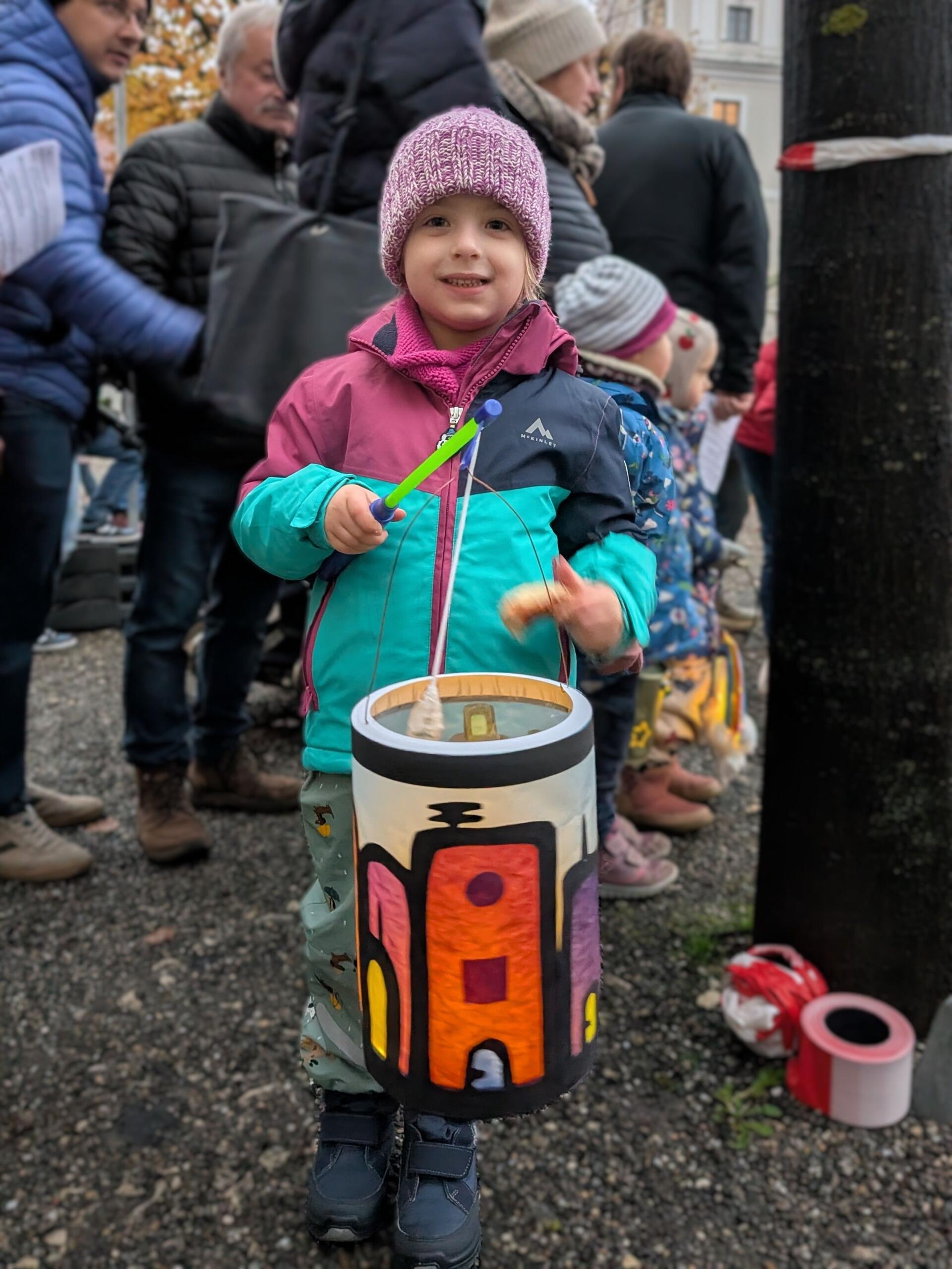Angeführt von St. Martin machten sich danach alle singend auf zum Laternenumzug um den Karlsplatz. Diesmal wurden sogar zwei Runden gedreht.