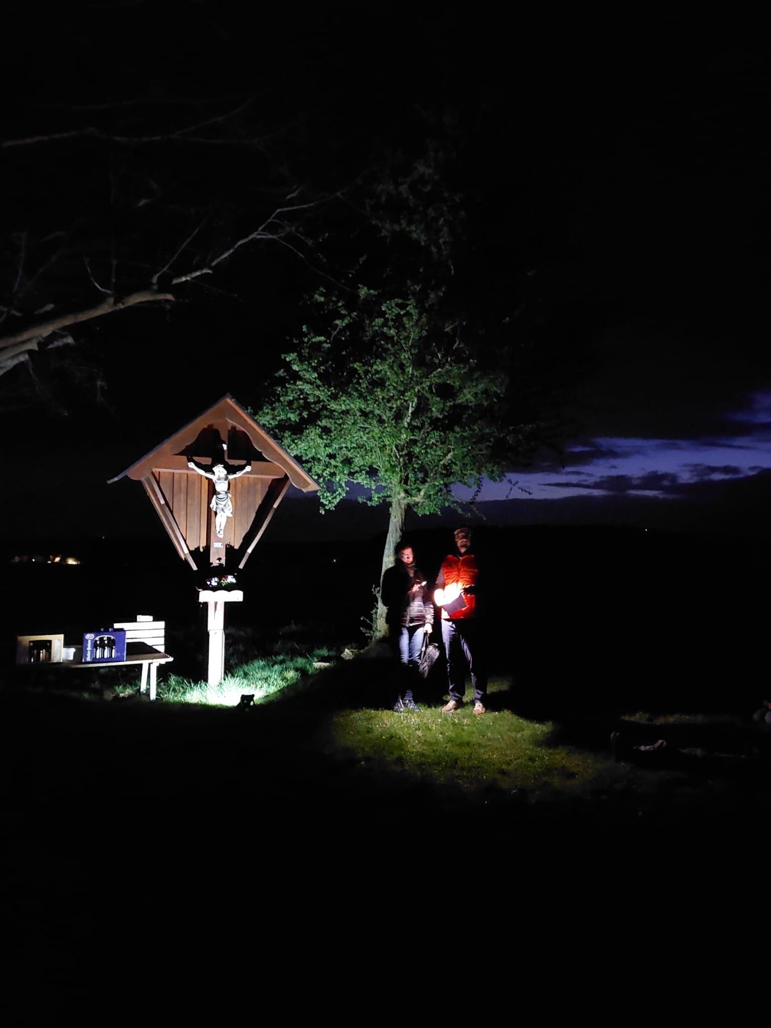 machten wir uns auf den Weg zum Feldkreuz bei Ballersdorf. Der Vollmond versteckte sich zwar hinter den Wolken, doch oben am