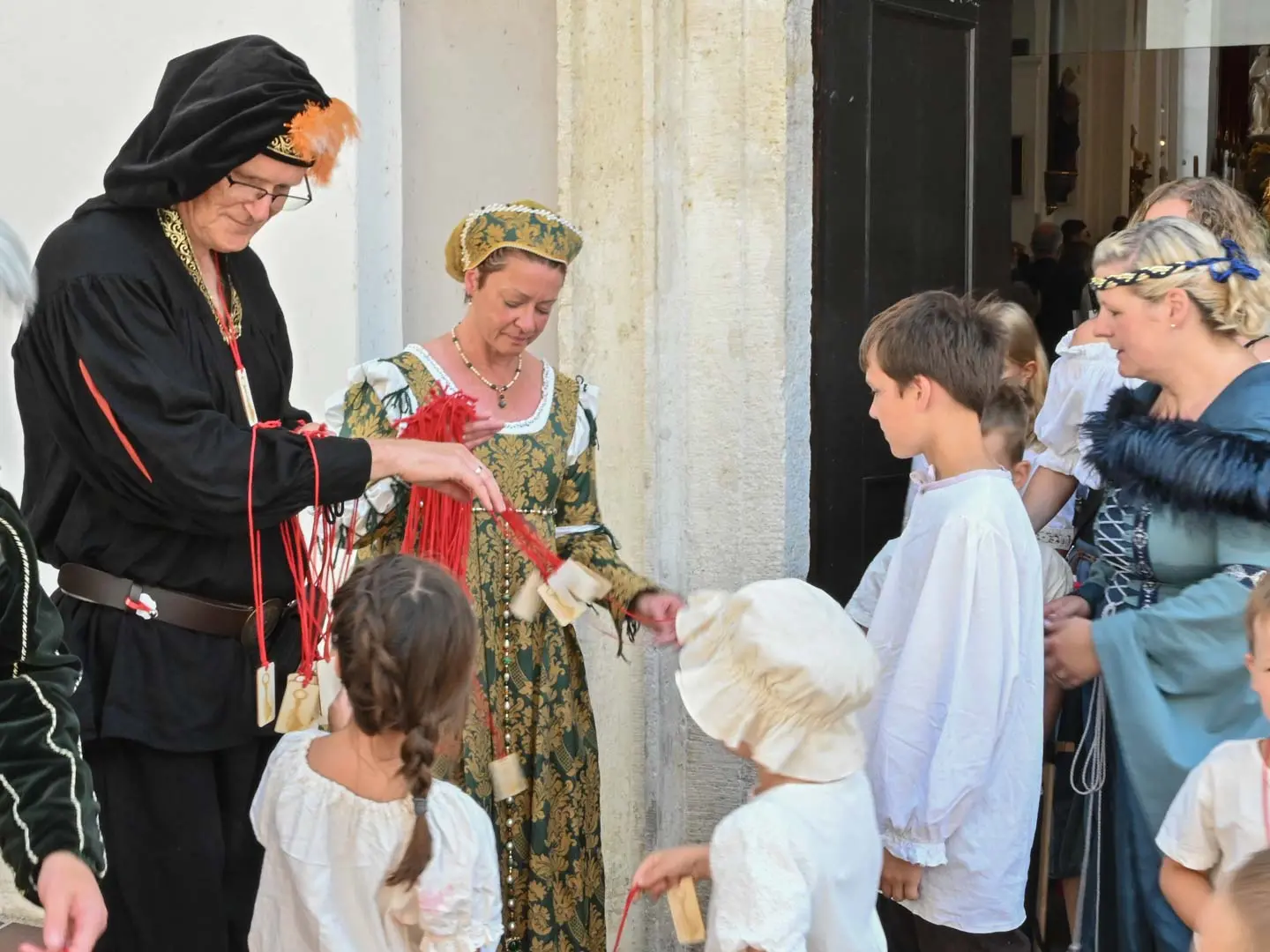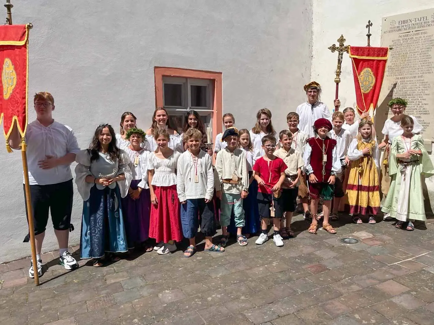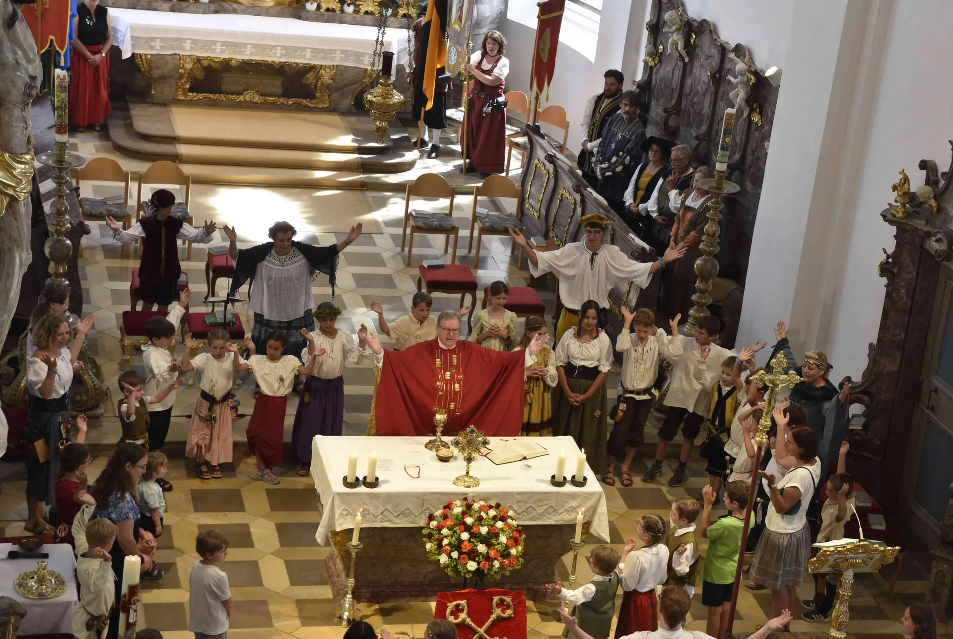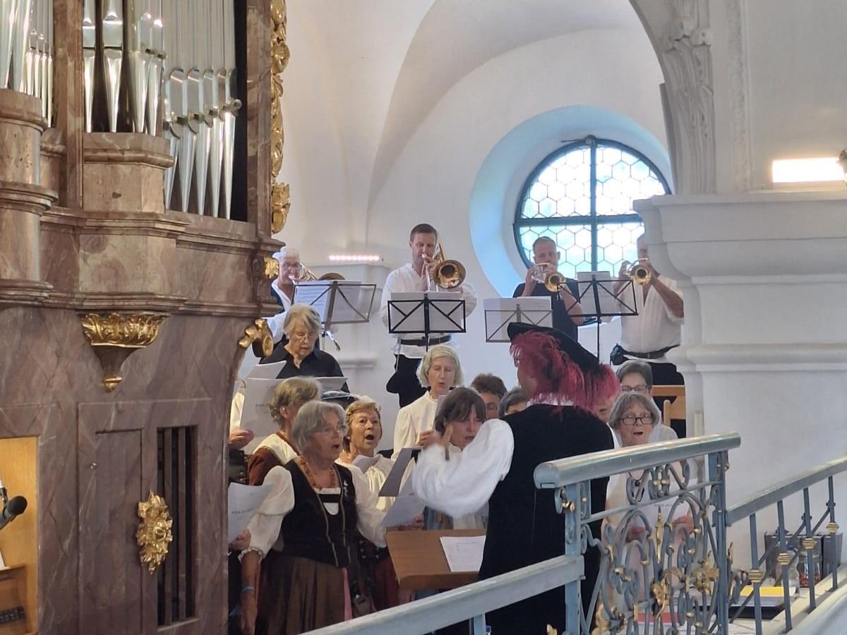 Grund genug, sich was Besonderes einfallen zu lassen. Begleitet von Posaunen und Trompeten zog Stadtpfarrer Herbert Kohler mit allerlei „Gesinde“ in die volle Stadtpfarrkirche ein: Fahnenabordnungen, viele Kinder (die dann zum Kindergottesdienst in den Pfarrgarten weiterzogen), die große Schar der Ministranten – diesmal in Schlossfestgewand – und Vertreter des Verkehrsvereins – natürlich in ihren edlen Gewändern. Dazu setzte der Kirchenchor mit Werken aus der Renaissancezeit sehr schöne und passende musikalische Akzente. Durch die zahlreichen im Kostüm erschienen Gläubigen ergab sich auch im Kirchenschiff ein außergewöhnlich buntes Bild und der kräftige Gemeindegesang in der bis in die Emporen gefüllten Kirche machten natürlich auch Eindruck.