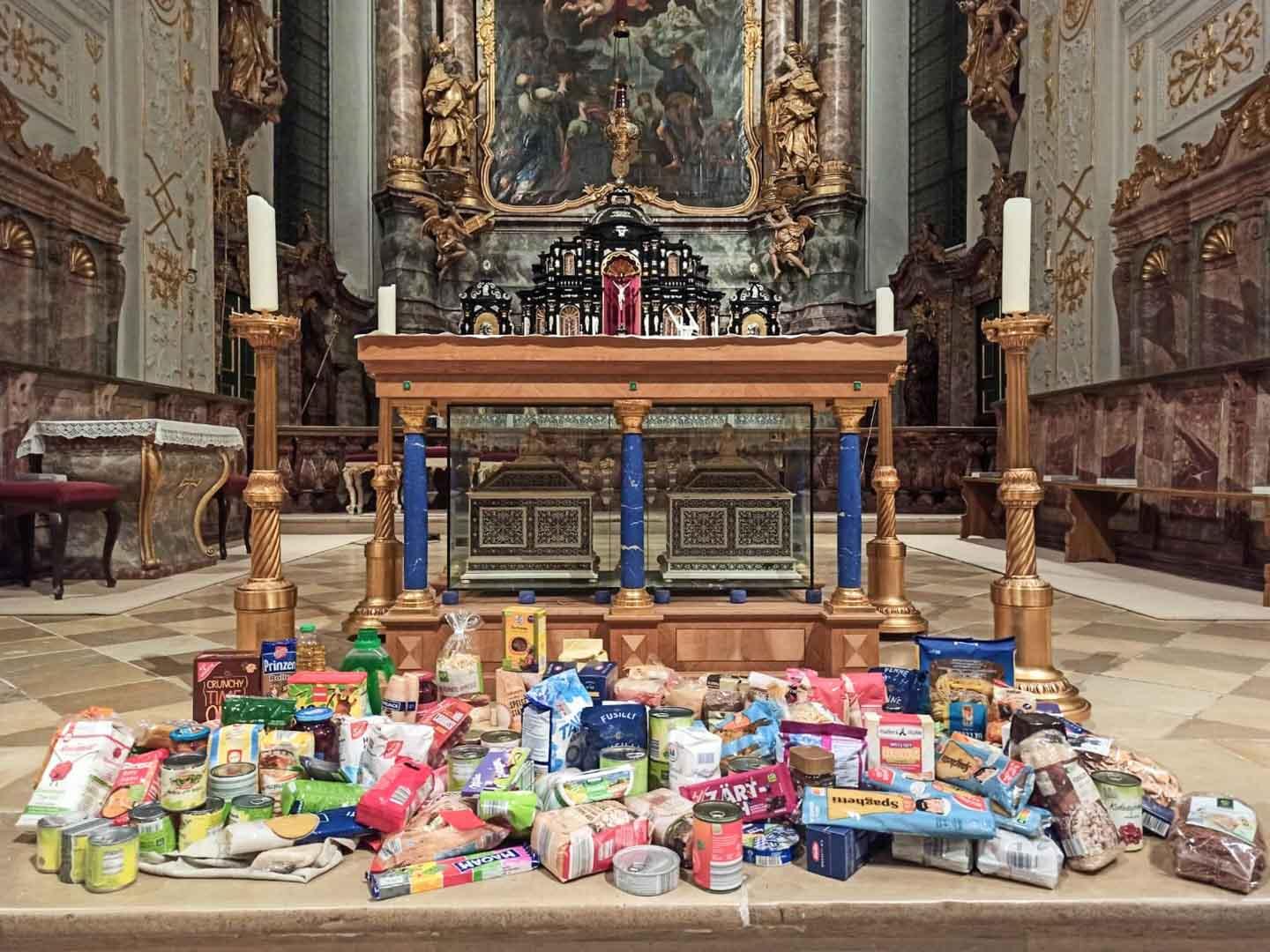 Als Beitrag zur Solidarität brachten viele auch Lebensmittel-Spenden mit, die sie vor den Altar der Neuburger Hofkirche legten.