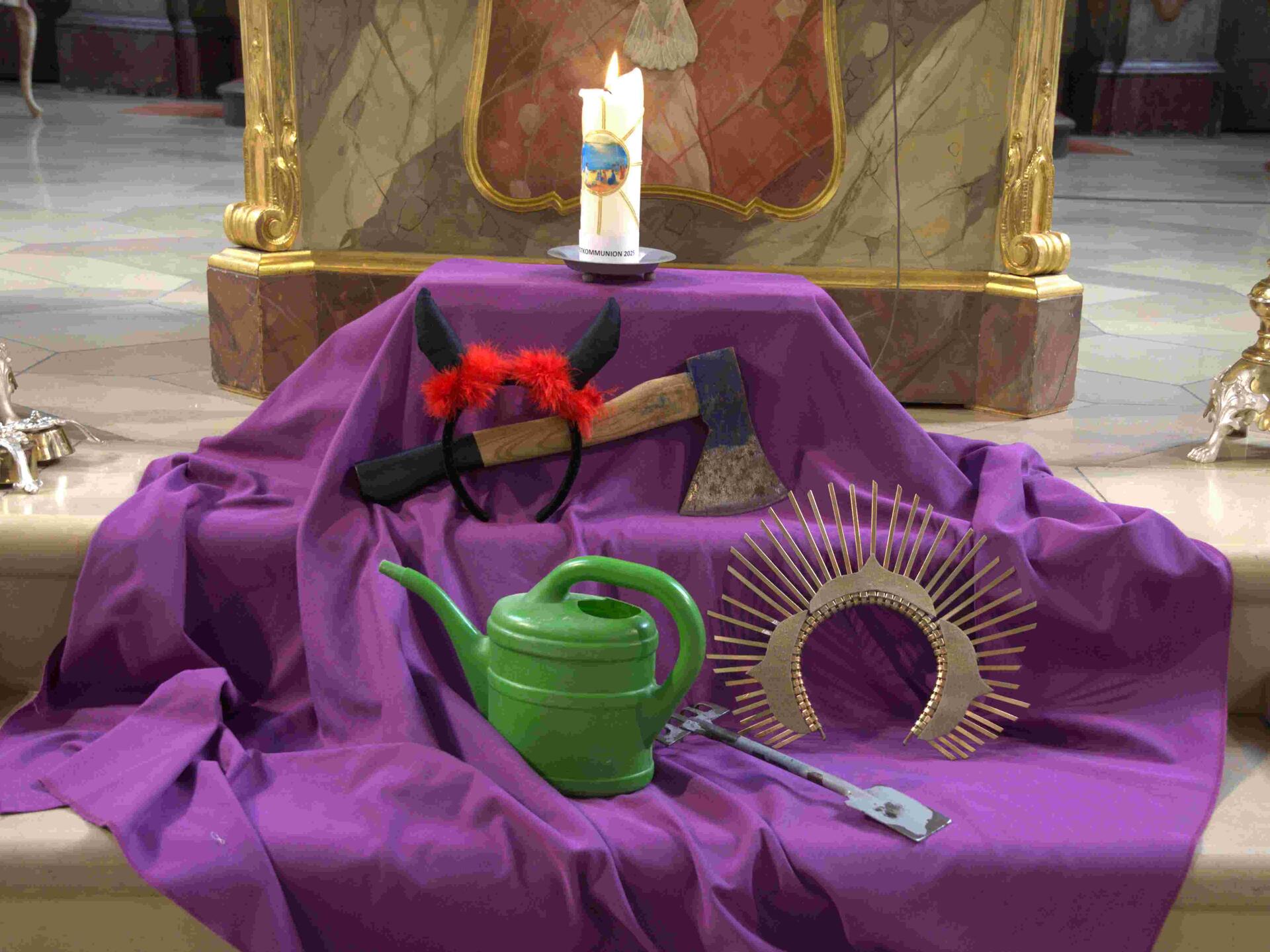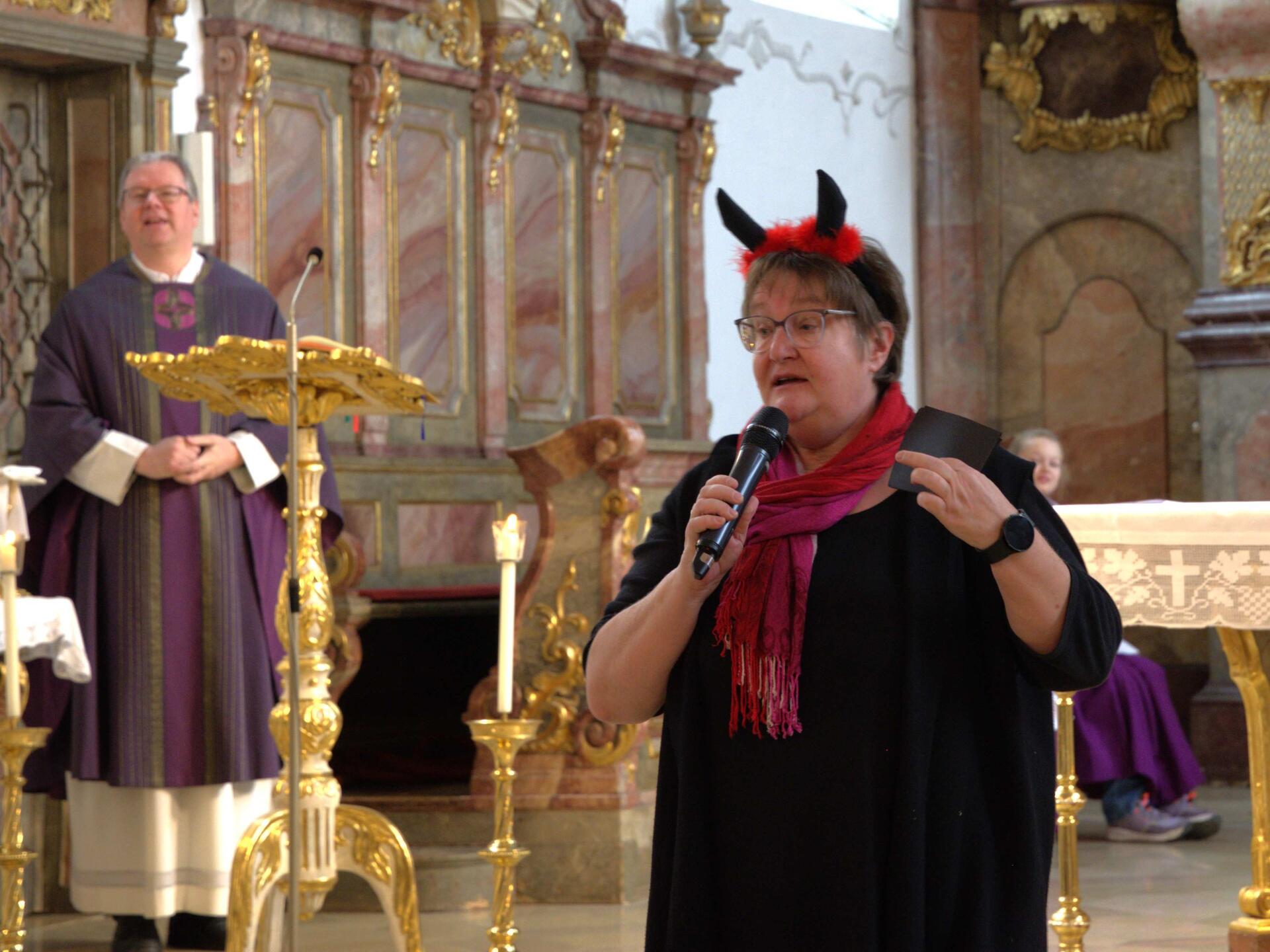 (Christine Jann) In Hl. Geist hatten beim Vormittagsgottesdienst wieder das Engelchen und das Teufelchen, die vom letzten Familiengottesdienst schon bekannt sind, einen Auftritt. Das Evangelium vom Feigenbaum, der keine Früchte bringt, war eine wunderbare Vorlage für das Teufelchen (alias Anne Strahl): Wieso immer Geduld haben mit all den Menschen und Aktionen, die keine Frucht bringen, wenn doch Gott selbst sagt, ein Feigenbaum ohne Frucht soll umgehauen werden?