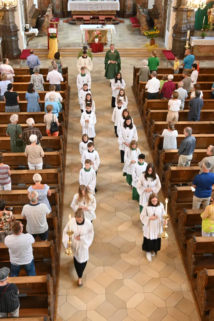Zum Abschied zelebrierten dann auch Pfarrer Herbert Kohler und Kaplan Dominic Leutgäb den Gottesdienst gemeinsam. Alle Pfarreien entsandten Vertreter und Ministranten, um ein großes Dankeschön an die in allen Pfarreien aktive Pastoralreferentin auszudrücken. Dementsprechend lang war der Einzug des liturgischen Dienstes.