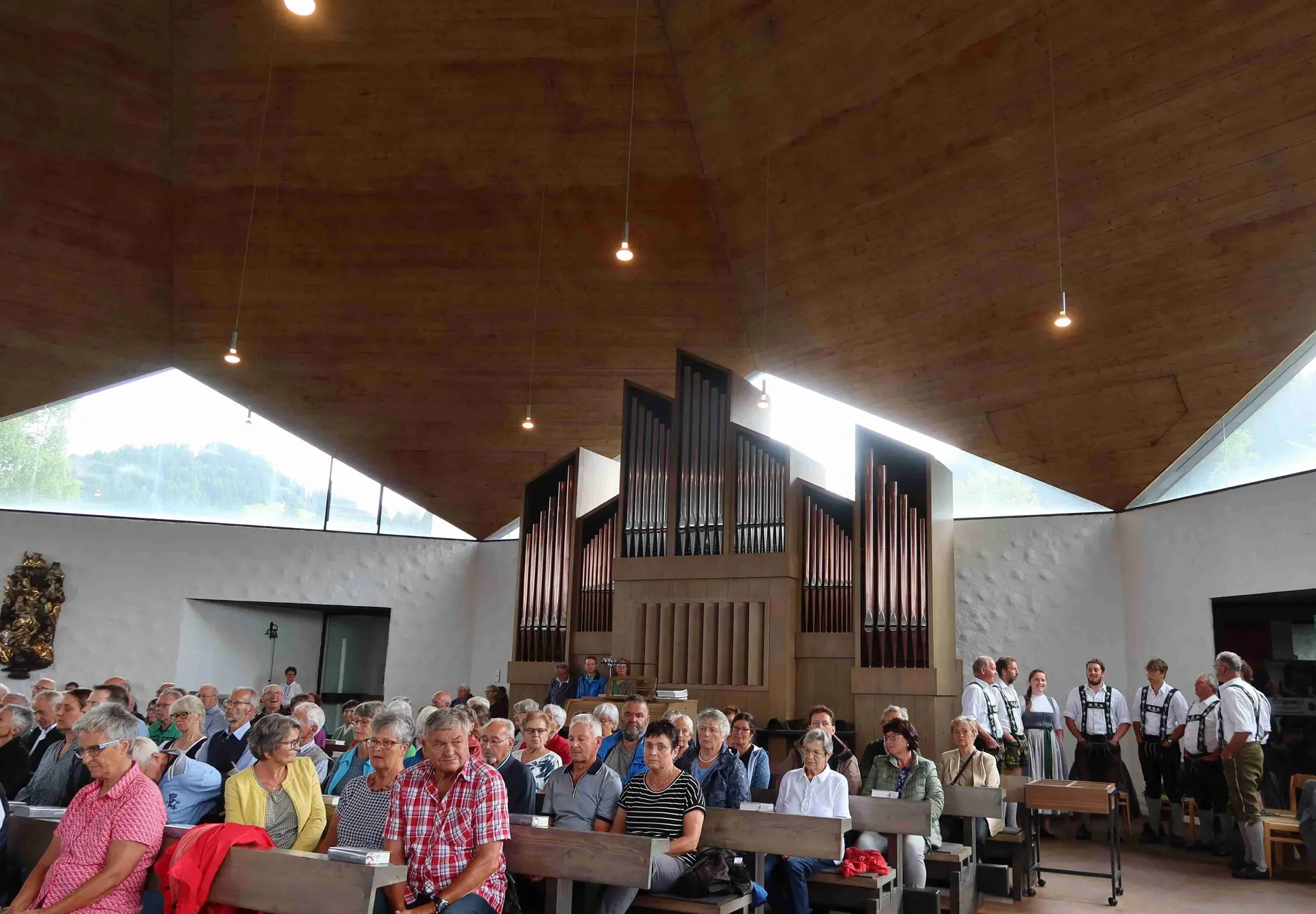 Die große, moderne Kirche, deren riesige Fensterflächen den Blick auf die Berge ermöglichen - zumindest bei schönen Wetter - kennt Pfarrer Herbert Kohler nur allzu gut aus seiner langjährigen Tätigkeit im benachbarten Jugendhaus Elias. So begrüßte er voller Freude alle Gläubigen und insbesondere die Johlergruppe, auf deren musikalische Begleitung er sich besonders freute, und lud dazu ein, sich von deren Musik das Herz öffnen und zu Gott tragen zu lassen.