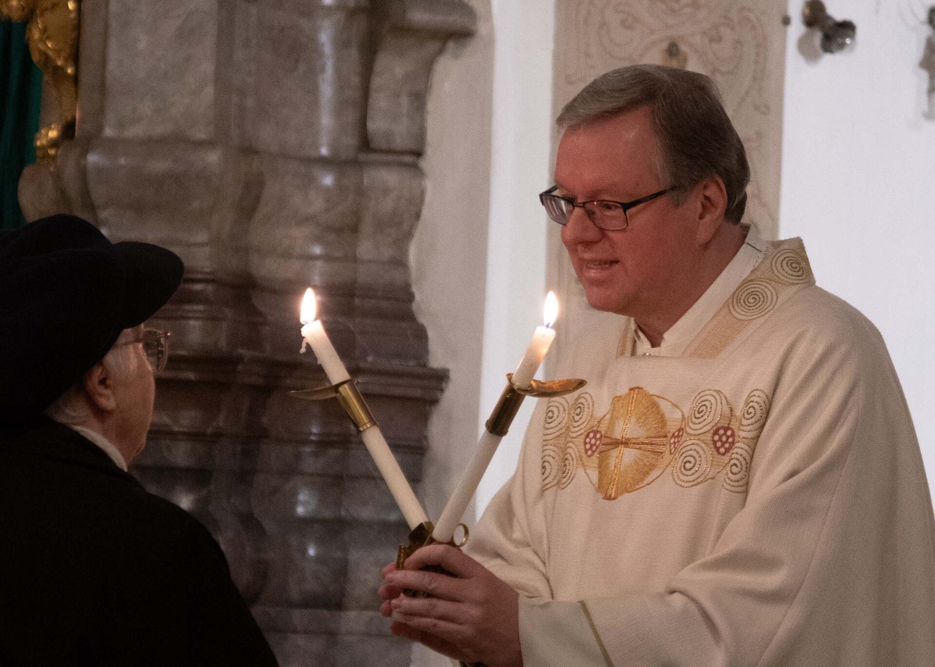 Nach der Segnung der Kerzen lud Pfarrer Herbert Kohler am Ende des Gottesdienstes alle Kommunionkinder und Kirchenbesucher zum Blasiussegen ein. Zusammen mit Gemeindereferentin Anne Strahl erbaten sie für jeden Einzelnen mit den typischen gekreuzten Kerzen Gesundheit und Schutz vor Halskrankheiten sowie allem Bösen.