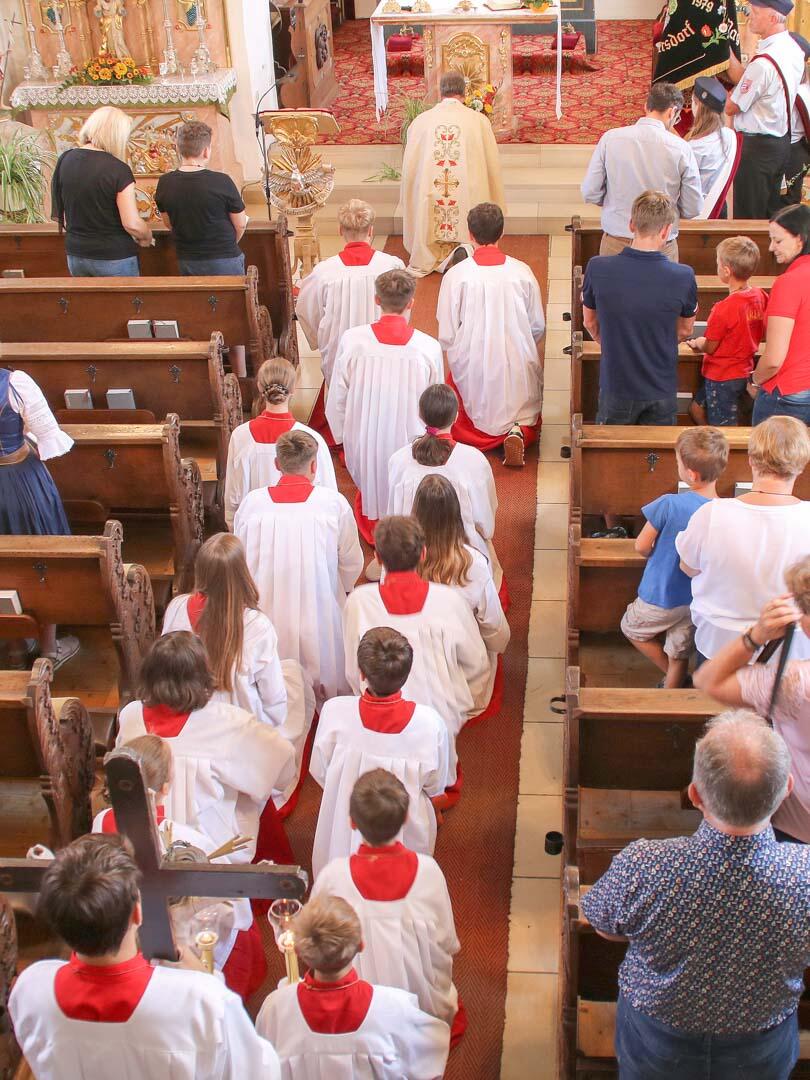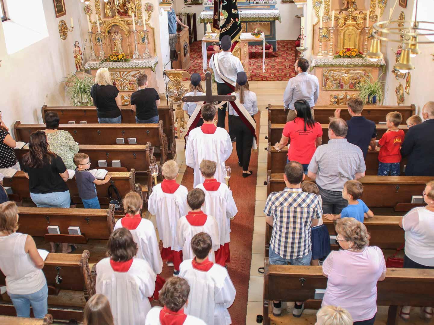 Pfarrer Herbert Kohler eröffnete das Dorffest mit einem festlichen Gottesdienst in der Kirche. Zahlreiche Gottesdienstbesucher waren gekommen und so zog unsere Fahne der Feuerwehr mit Fahnenabordnung, den Ministranten und Pfarrer Kohler in die Kirche ein.