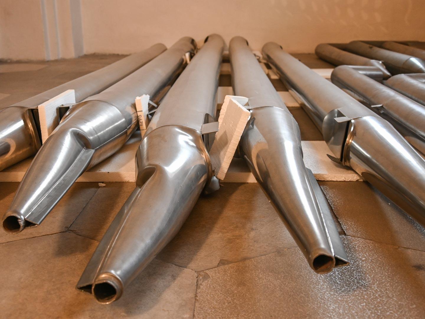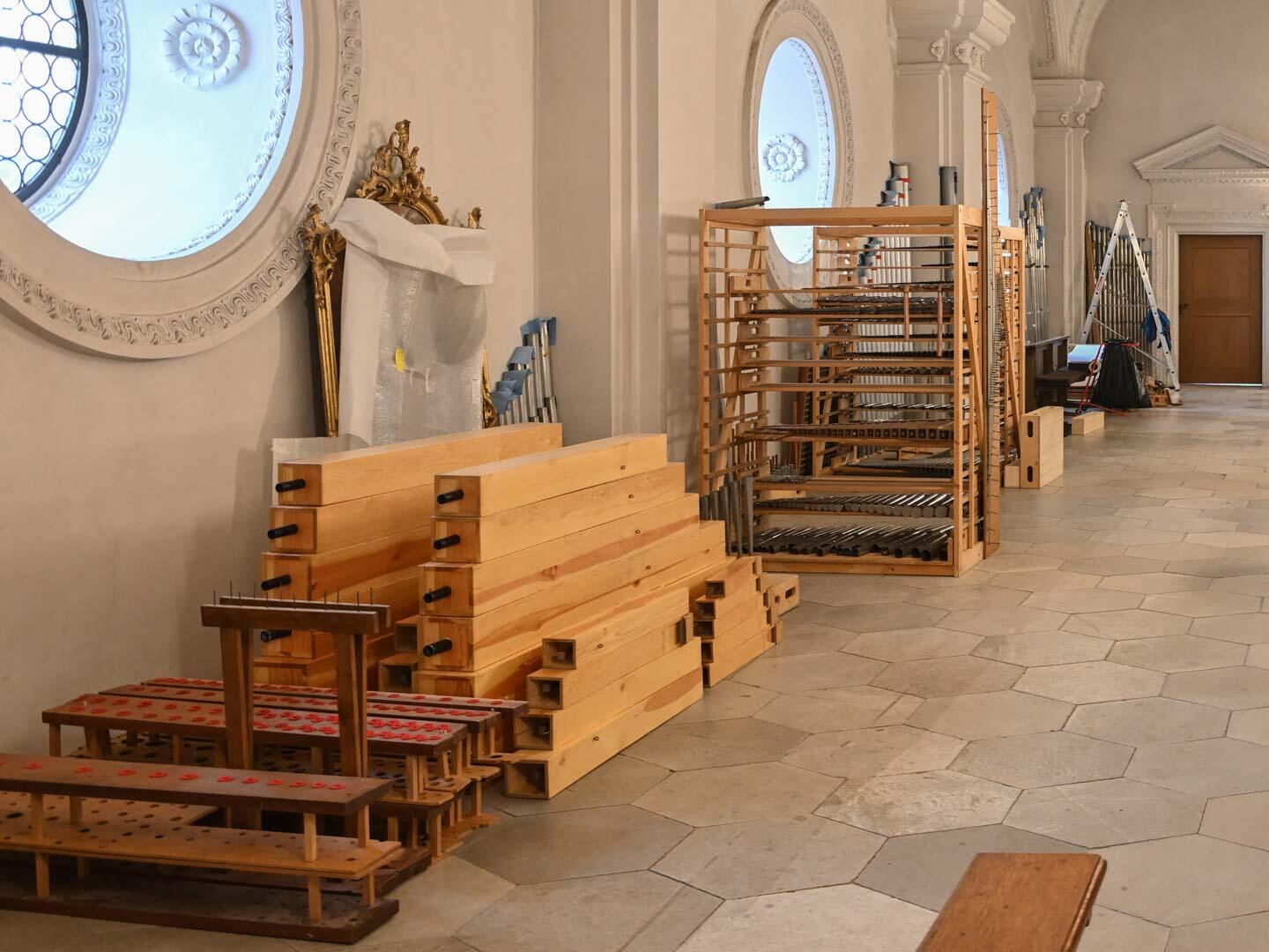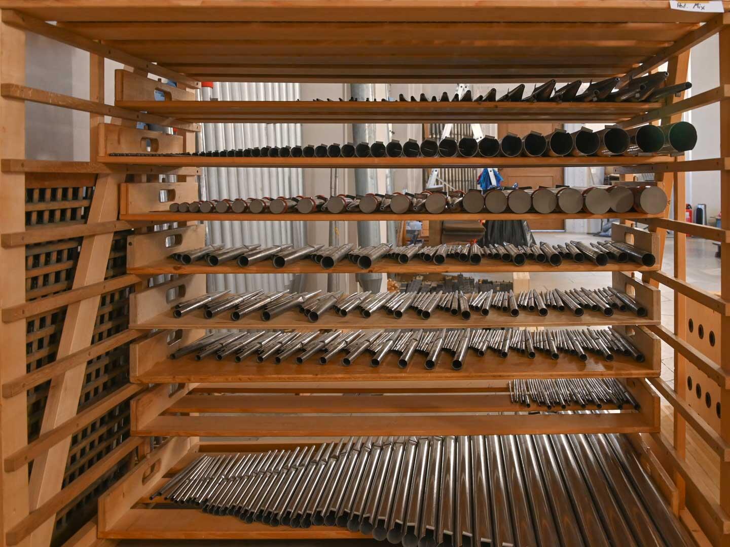 Stimmt das? Selten oder besser nie als jetzt lässt sich das nachprüfen. Denn auf der Empore sind die Pfeifen sauber und ordentlich und sicher gelagert. Ich mache ein paar Bilder und beginne zu zählen: eins, zwei, drei, ..., sechshundertzwölf, ..., achthundertzweiundfünfzig, ..., eintausendneunhundertsiebenunddreißig, eintausendneunhundertachtunddreißig, ...