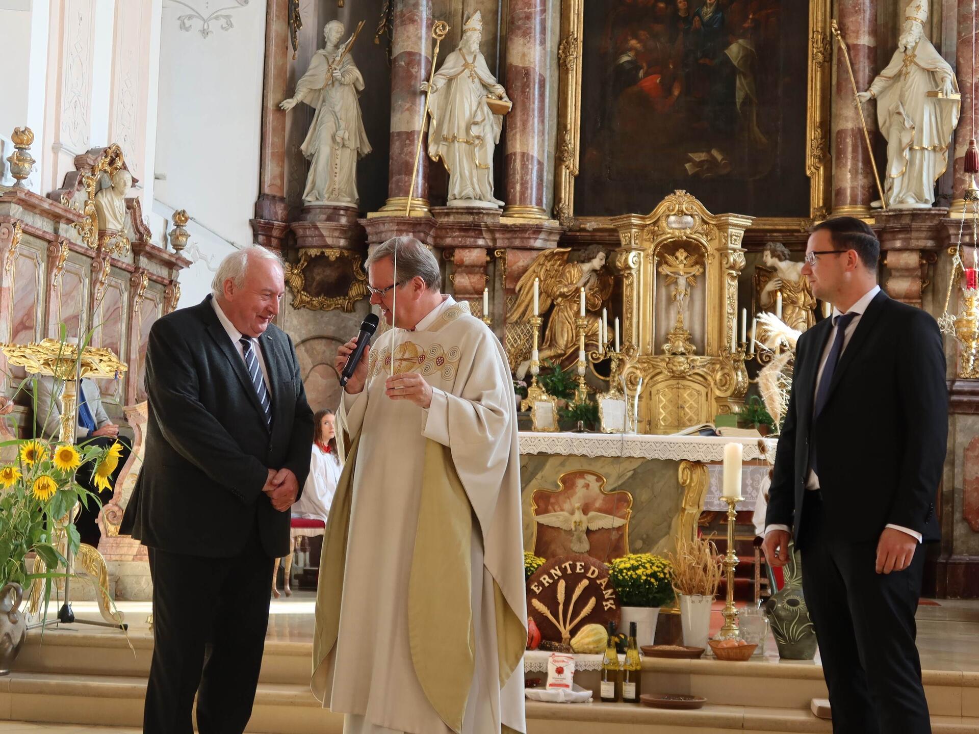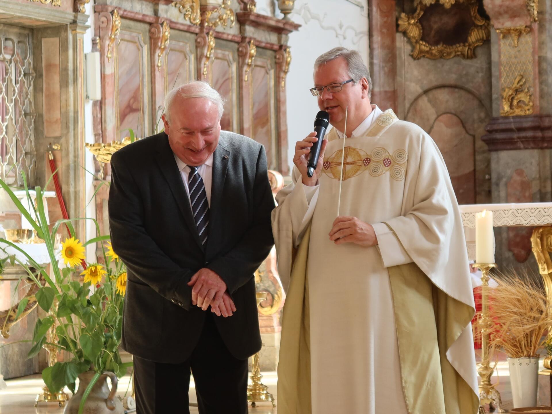 (Christine Jann) In diesem Jahr fiel Erntedank genau auf den 1. Oktober – just auf den Tag, an dem der neue Kirchenmusiker der beiden Stadtpfarreien St. Peter und Hl. Geist, Michael Bachmann, seinen Dienst in Neuburg aufnahm. So konnte Pfarrer Herbert Kohler in der Hl. Geist Kirche die Übergabe des Dirigentenstabs vom langjährigen Kirchenmusiker Max Höringer auf seinen Nachfolger Michael Bachmann moderieren und damit seinen besonderen „Erntedank“ verbinden.