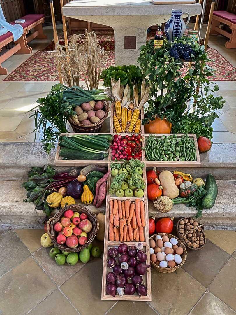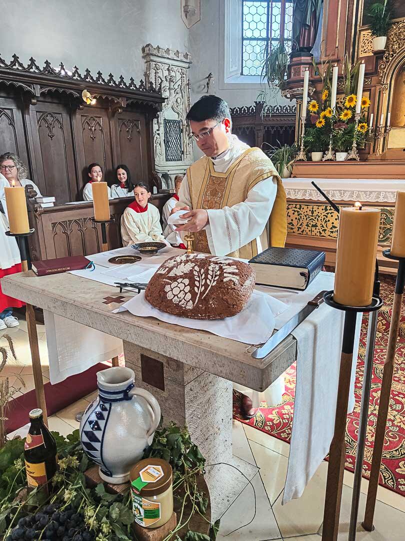 In diesem Jahr erstrahlte der Erntedankaltar in neuem Glanz. Die Früchte und das Gemüse, die dort präsentiert wurden, finden im Rohrenfelser Kindergarten Verwendung und werden zu köstlichen Mahlzeiten verarbeitet. Der Erntedankbrotlaib wurde am Ende der Messfeier unter allen Besuchern geteilt.