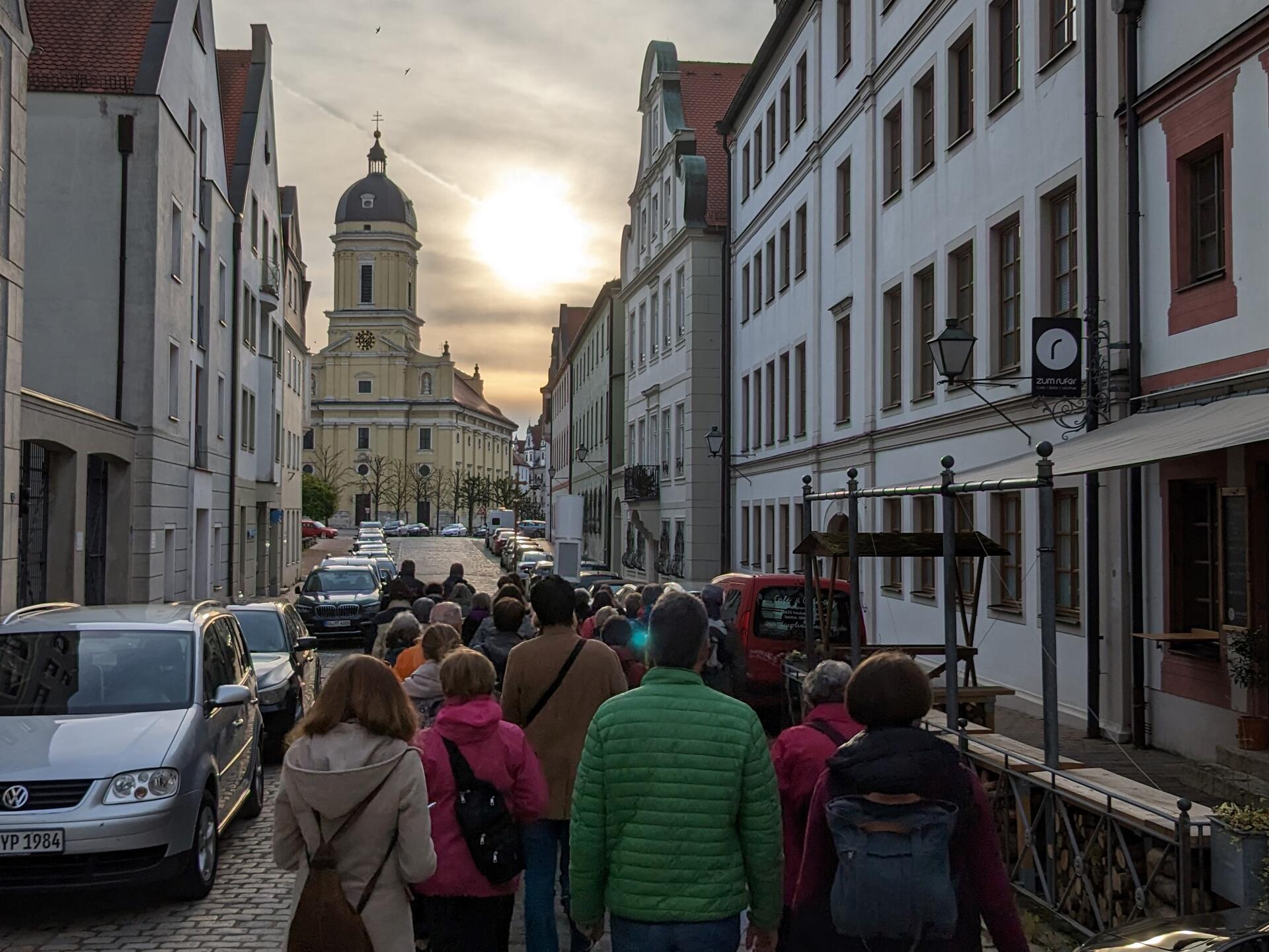 Um 7:00 Uhr trafen sich die ersten Wallfahrer vor der Pfarrkirche St. Peter und wurden von Pfarrer Herbert Kohler und dem Vorbereitungsteam begrüßt. Mit ca. 40 Personen ging es betend durch die Altstadt – vorne weg einige Ministranten aus St. Peter, die das Kreuz trugen.