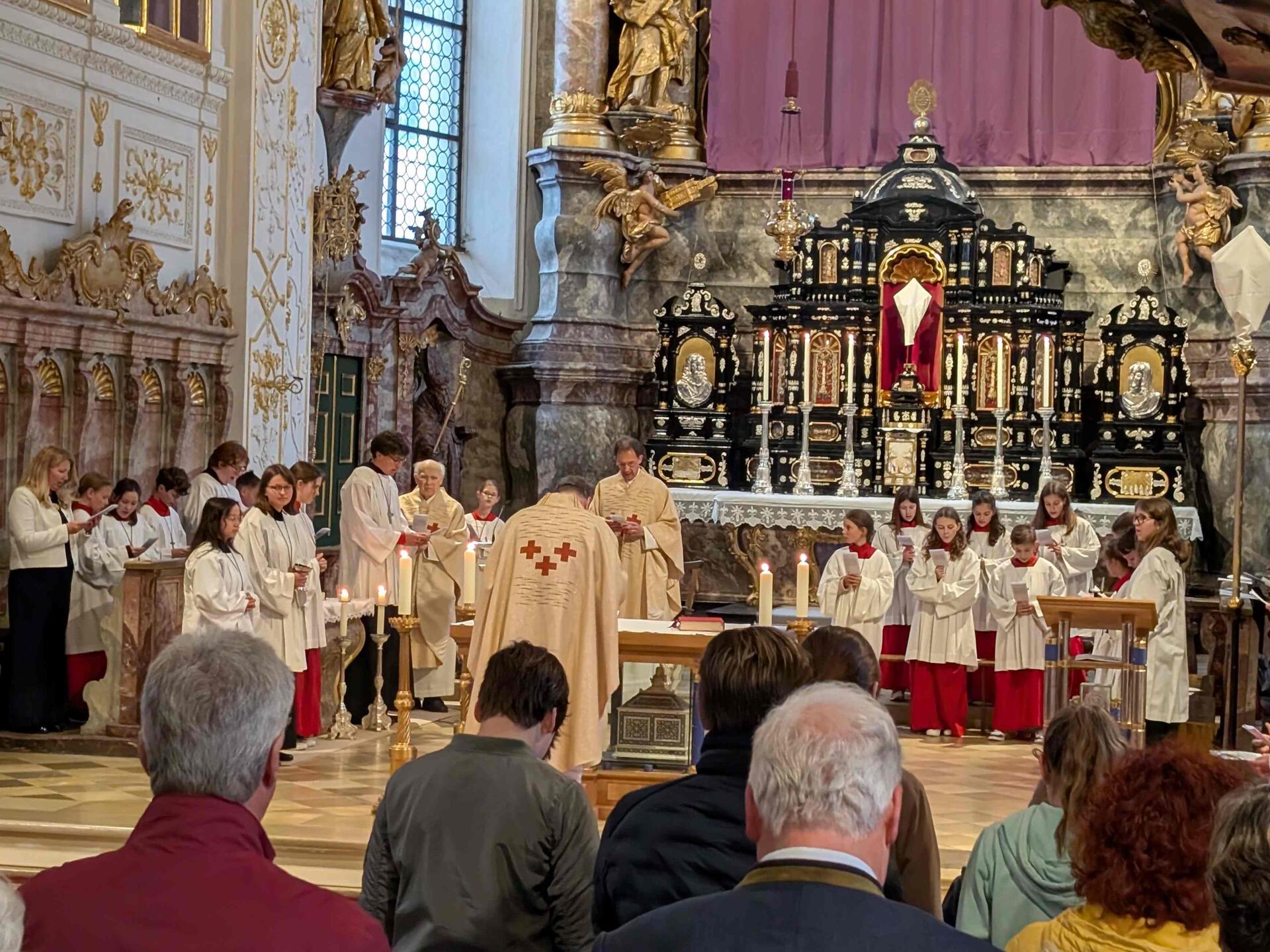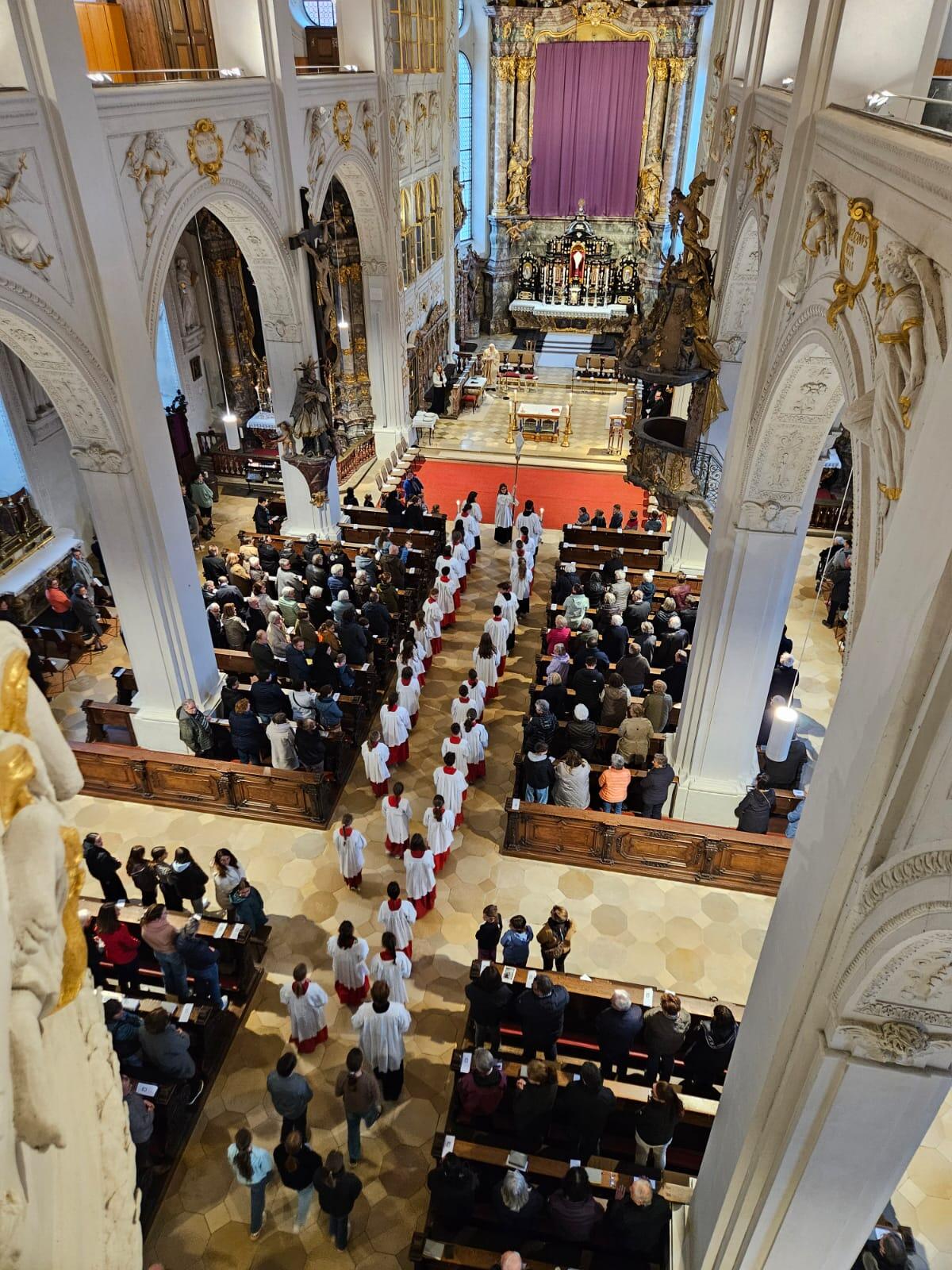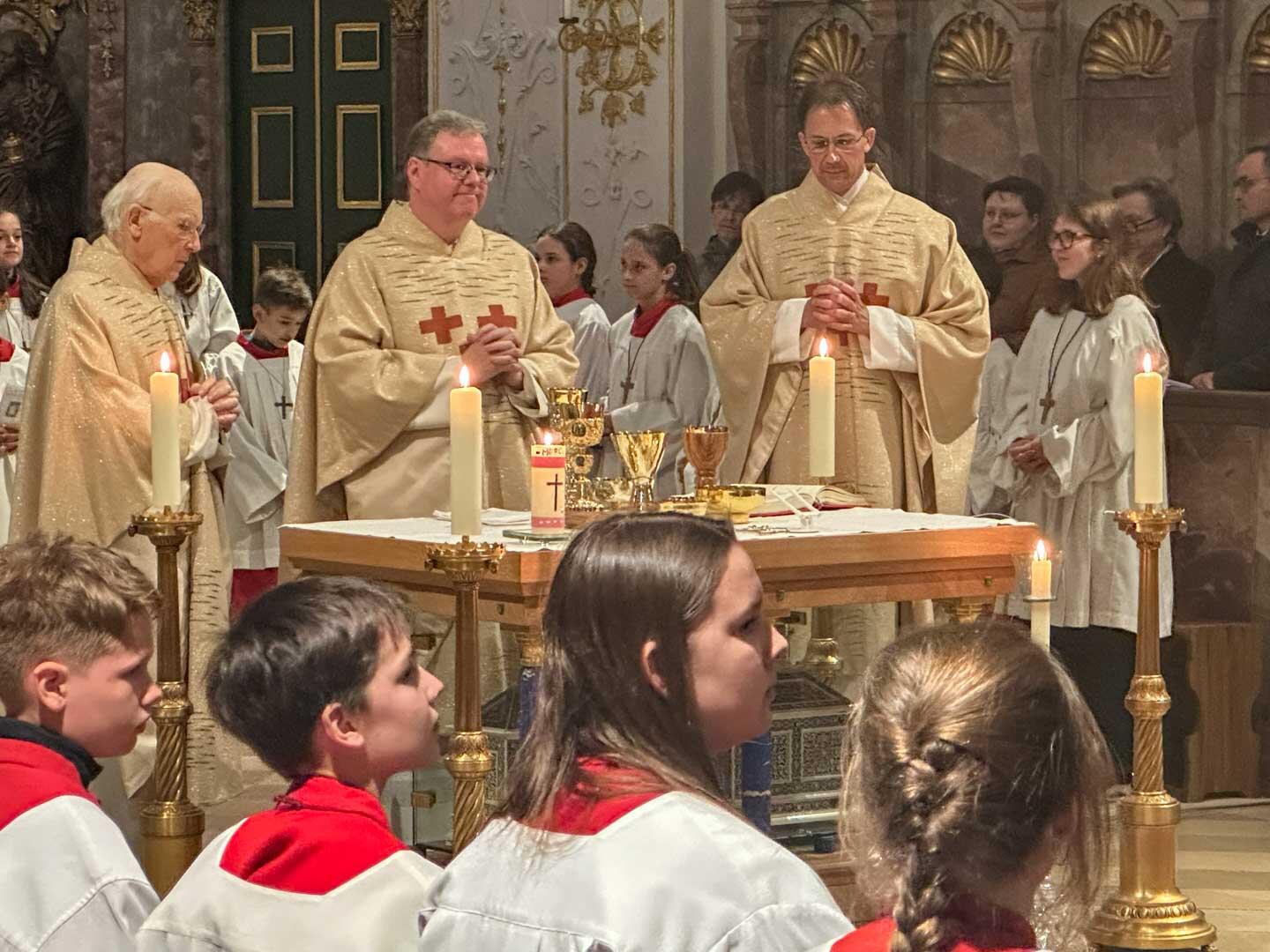 Pfarrer Herbert Kohler, der zusammen mit Msgr. Wengert und Kaplan Reißner die Feier zelebrierte, nutzte die Gelegenheit in der vollen Hofkirche und sprach den vielen in der Kirche Engagierten seinen Dank für ihre zahlreichen Dienste aus. Er dachte an die Ministranten, von denen an die 40 mit dabei waren, die Mesner, die Lektoren, die Kommunionhelfer, die Pfarrgemeinderäte und Kirchenverwaltungsmitglieder, die Musiker und Chormitglieder und einfach an alle, die sich in irgendeiner Weise einbringen.