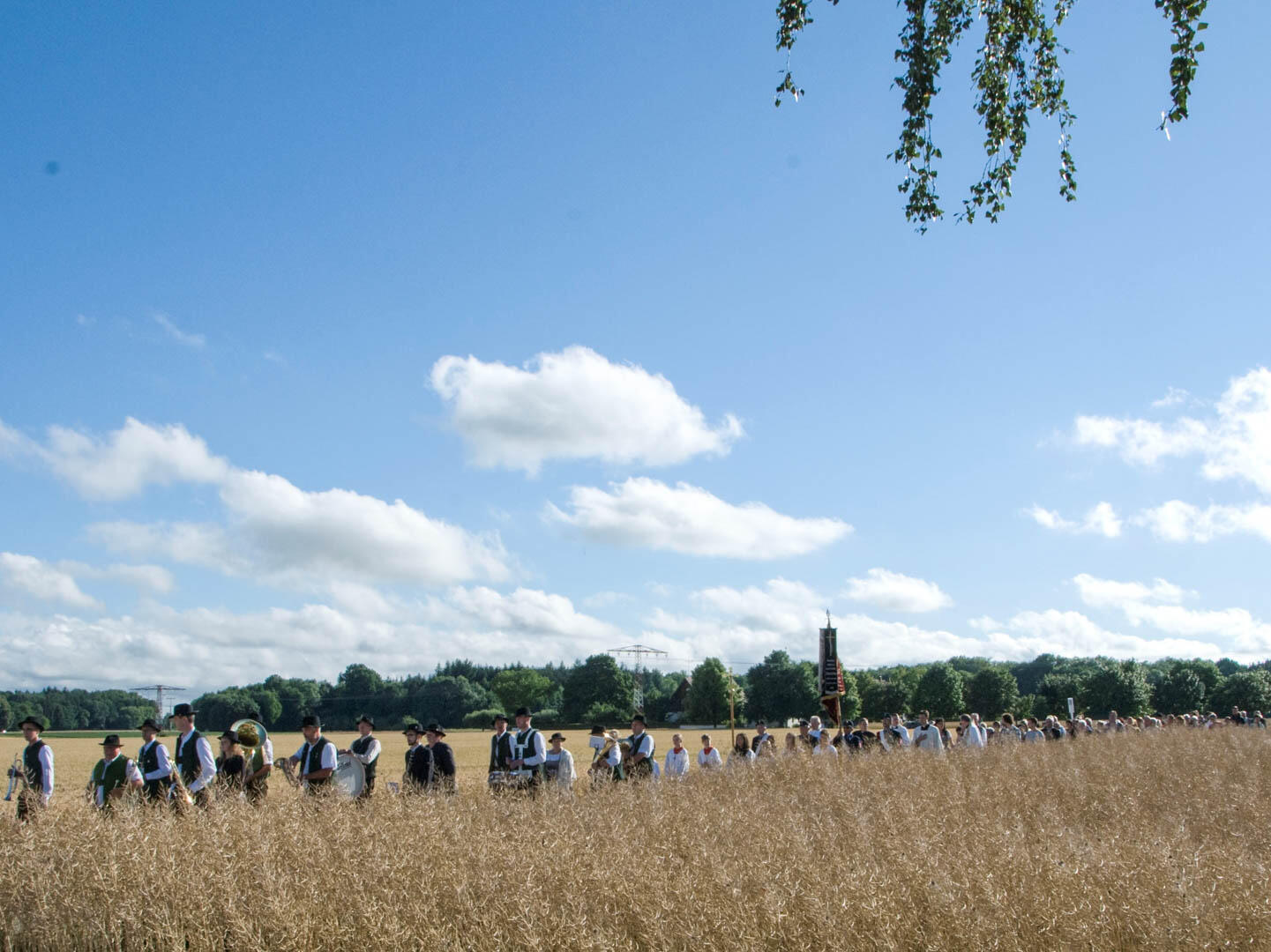 Von der Blaskappelle begleitet zog der Zug dann bei mittlerweile strahlendem Wetter singend und betend nach Feldkirchen. Auf dem Kahlhofweg schlossen sich noch weitere Anwohner an, um der Segnung der Primizstele am Elternhaus beizuwohnen.