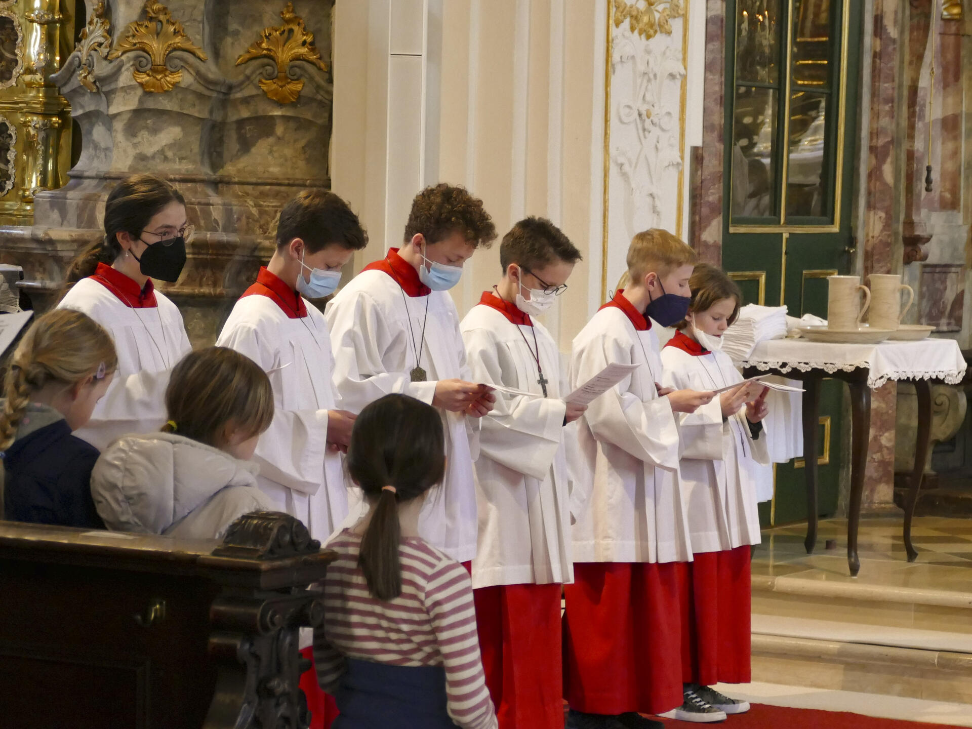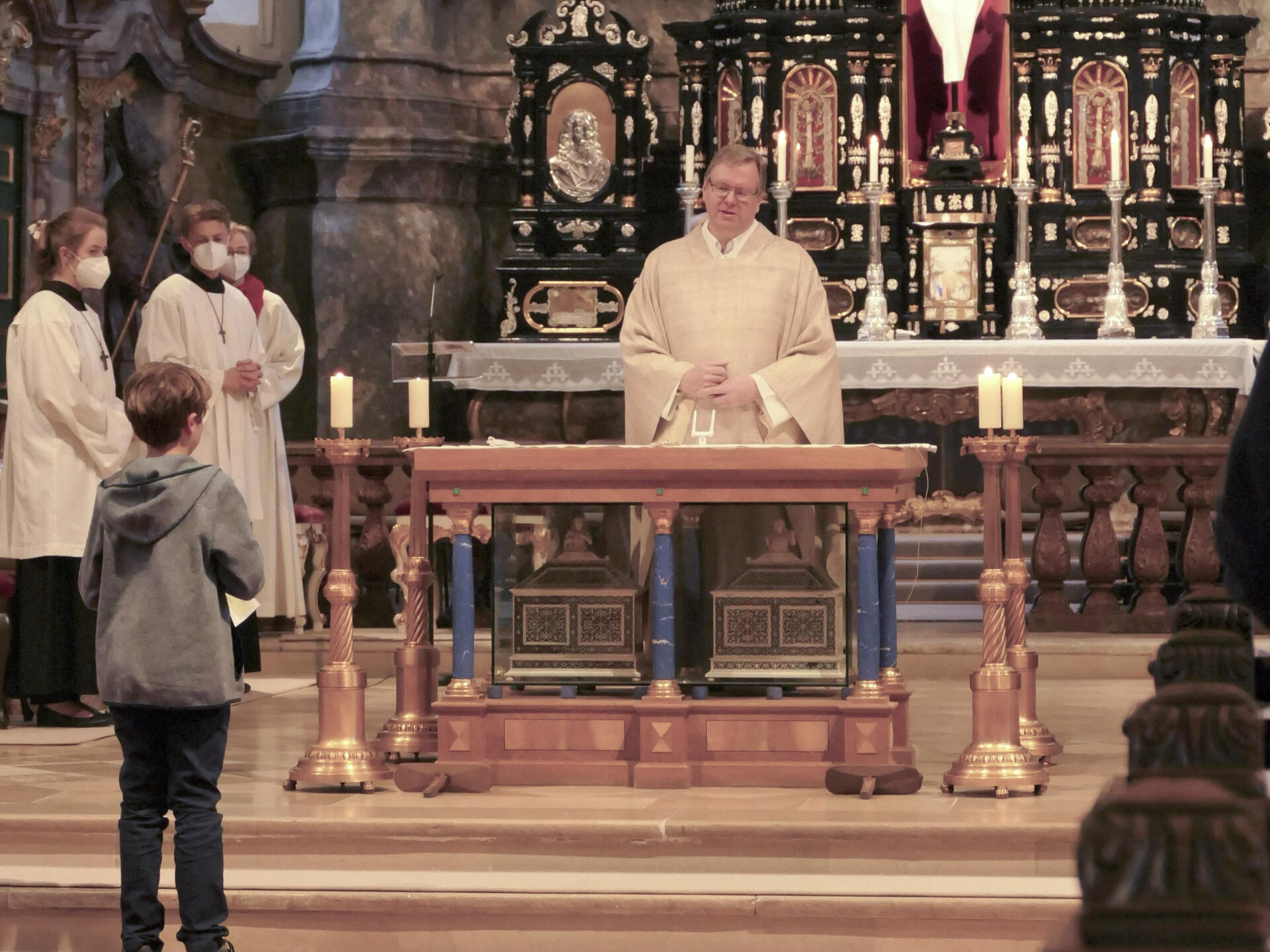Der kleine Franz durfte am Ende auch nochmal ran: mit Pfarrer Kohler entfernte er den Altarschmuck und lernte, dass im Gedenken an den Weg Jesu der Schlusssegen ausbleibe und die Abendmahlsfeier mit einem stillen Auszug ende.