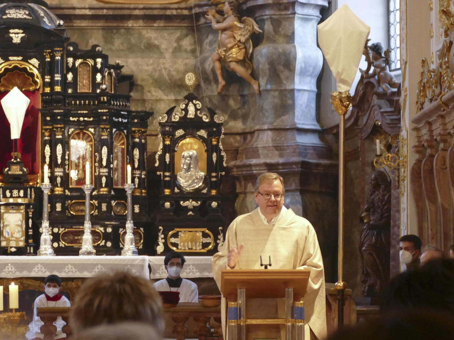 An dieser Stelle bedankte sich der Priester auch bei seinen hauptamtlichen Mitarbeiterinnen, Gemeindereferentin Anne Strahl und Pastoralassistentin Michaela Hertl. Nur dank ihrer Wortgottesfeiern sei es möglich, dass in allen Gemeinden am Sonntag Gottesdienste gefeiert werden könnten, die zudem großen Anklang fänden. Sein Plädoyer für Frauen in der Verkündigung führte zu spontanem Applaus in der Hofkirche.