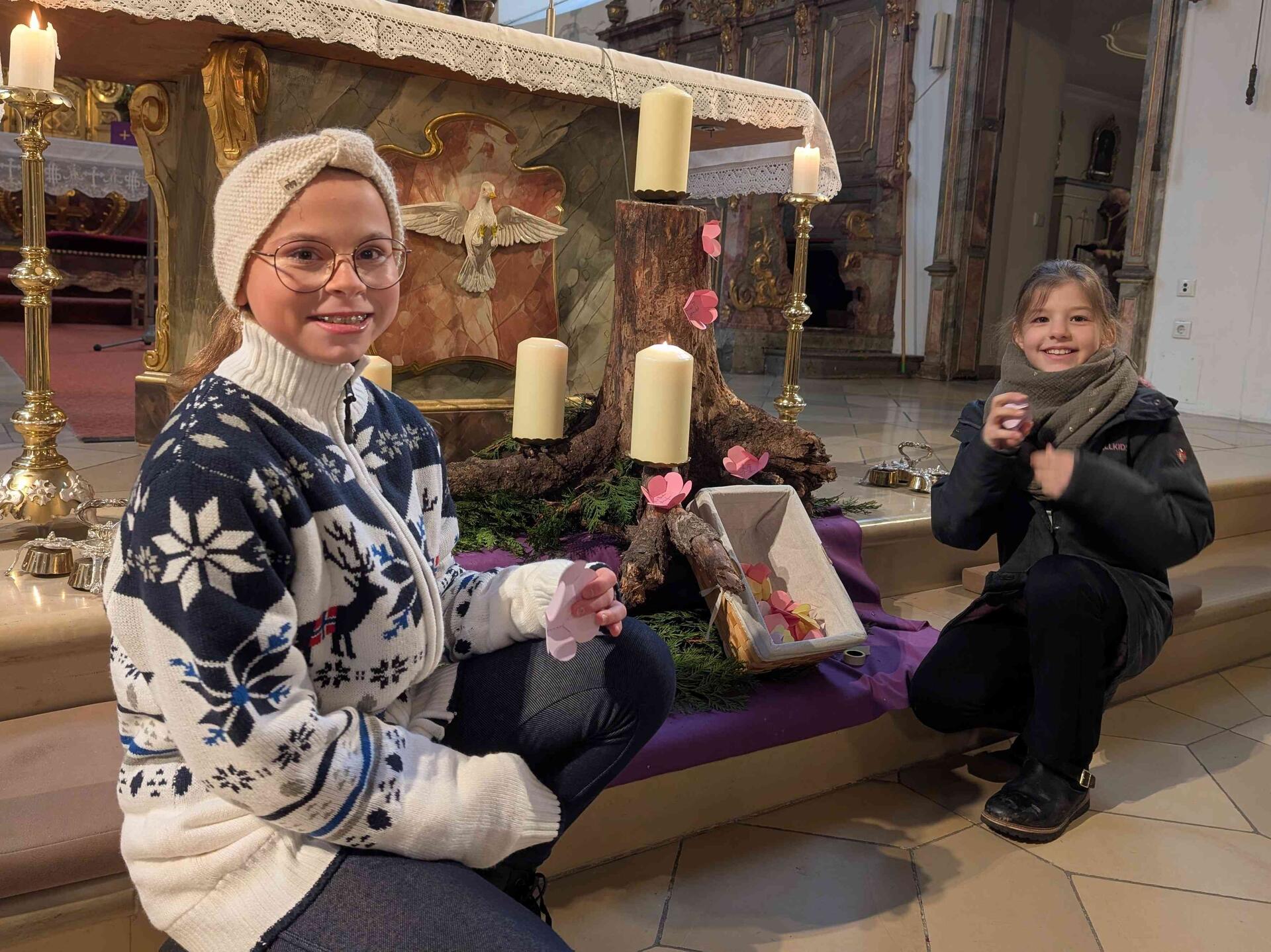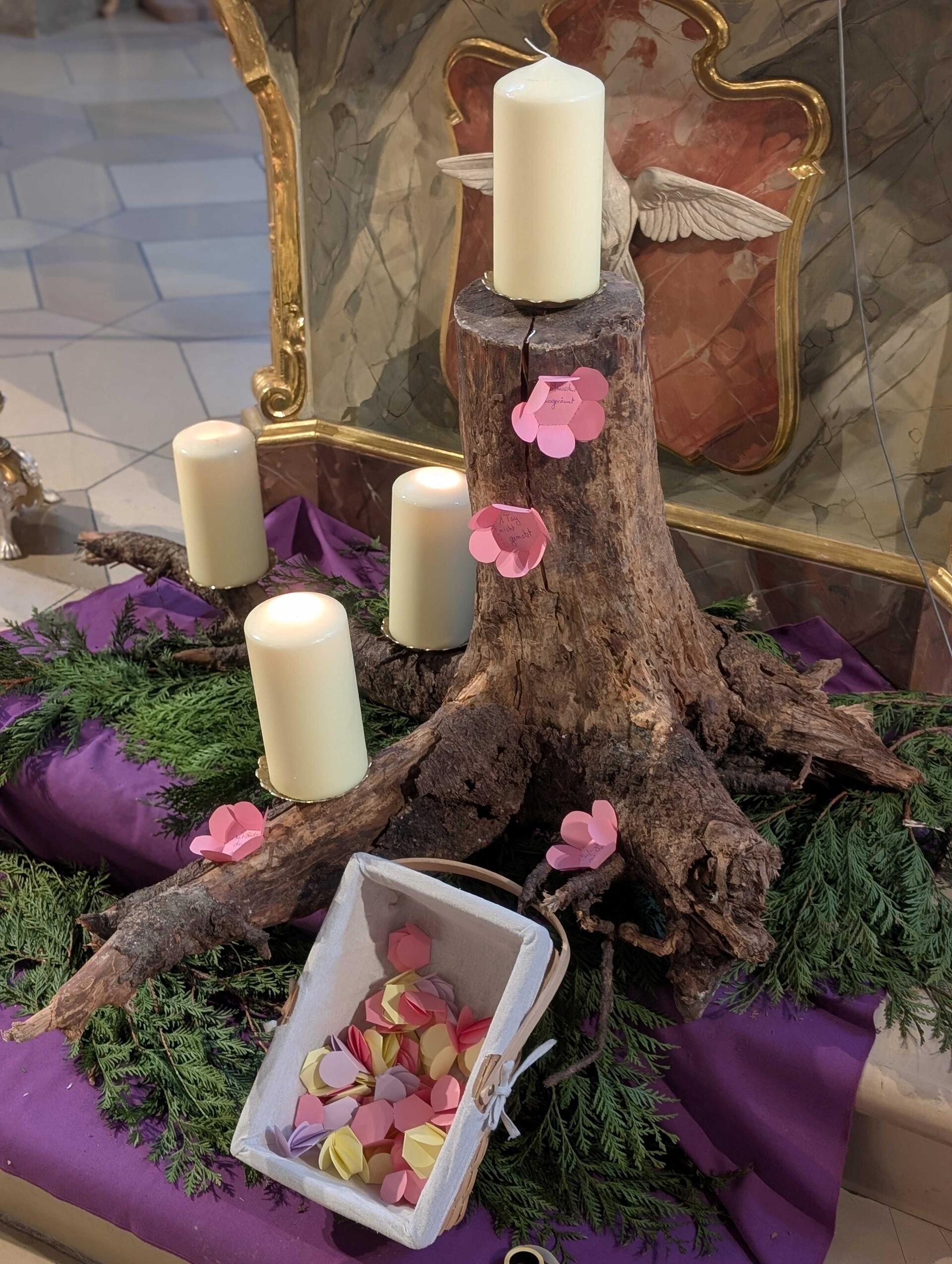 Am Ende des Gottesdienstes waren die Kinder aufgerufen, die Wurzel mit den Adventskerzen noch weiter zum „Blühen“ zu bringen: kleine Papierblüten waren zum Mitnehmen vorbereitet. Darauf sollten in den nächsten Adventstagen Ideen oder Erfahrungen festgehalten werden, die das Licht Christi aufscheinen lassen. Ein paar Kinder waren schon fleißig. „Ich hab mit meinem kleinen Bruder gespielt“ oder „Ich werde meine Oma besuchen“ stand da zum Beispiel.