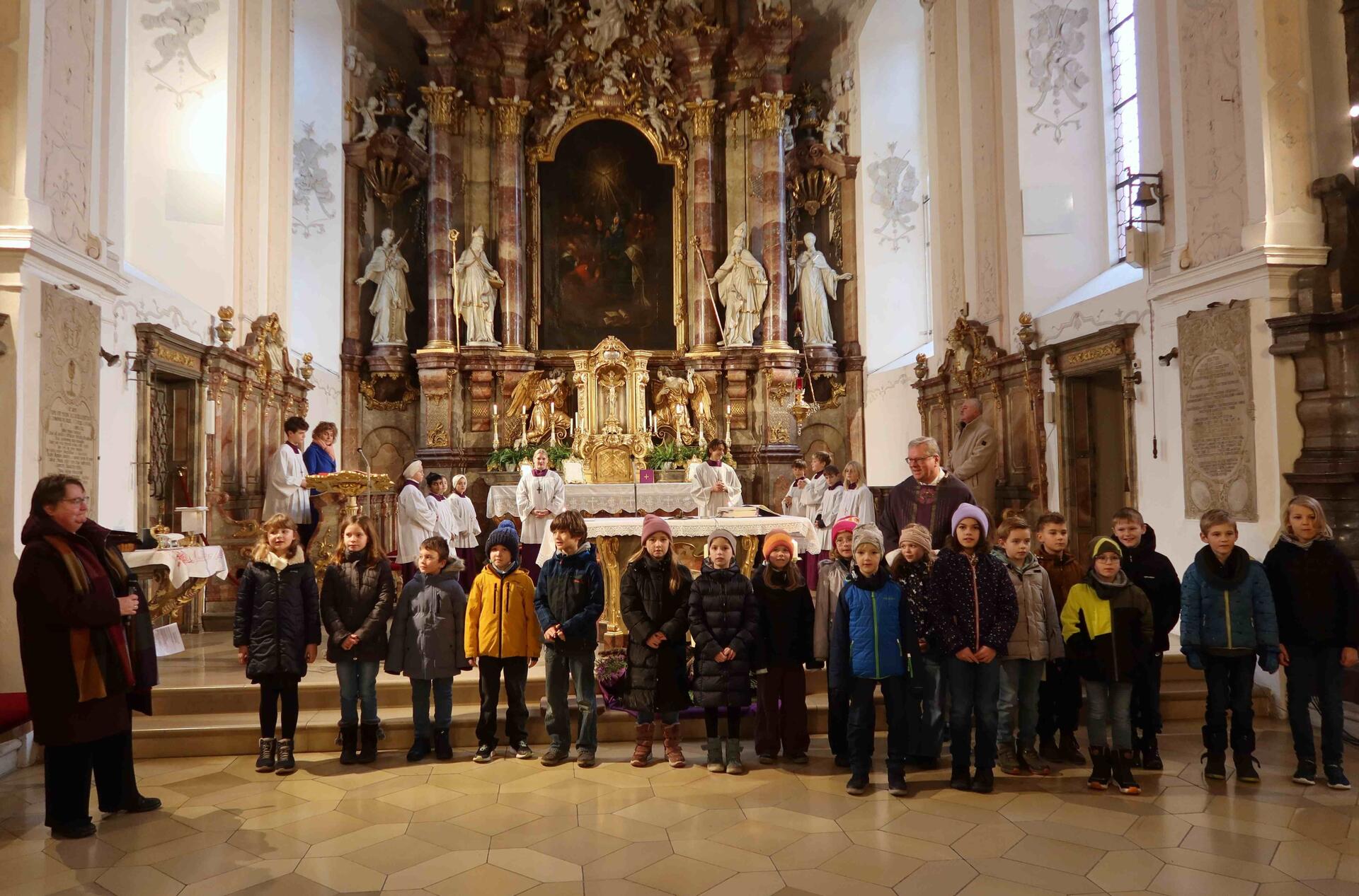 Gleich zu Beginn des Gottesdienstes bat Pfarrer Herbert Kohler die Kinder nach vorne. Unter der Anleitung von Gemeindereferentin Anne Strahl zeigten sie auch gleich, dass sie schon einiges gelernt haben, v.a. als sie das Lied zum Motto der Erstkommunion „Ihr seid meine Freunde“ der Gemeinde engagiert und kräftig vorsangen.