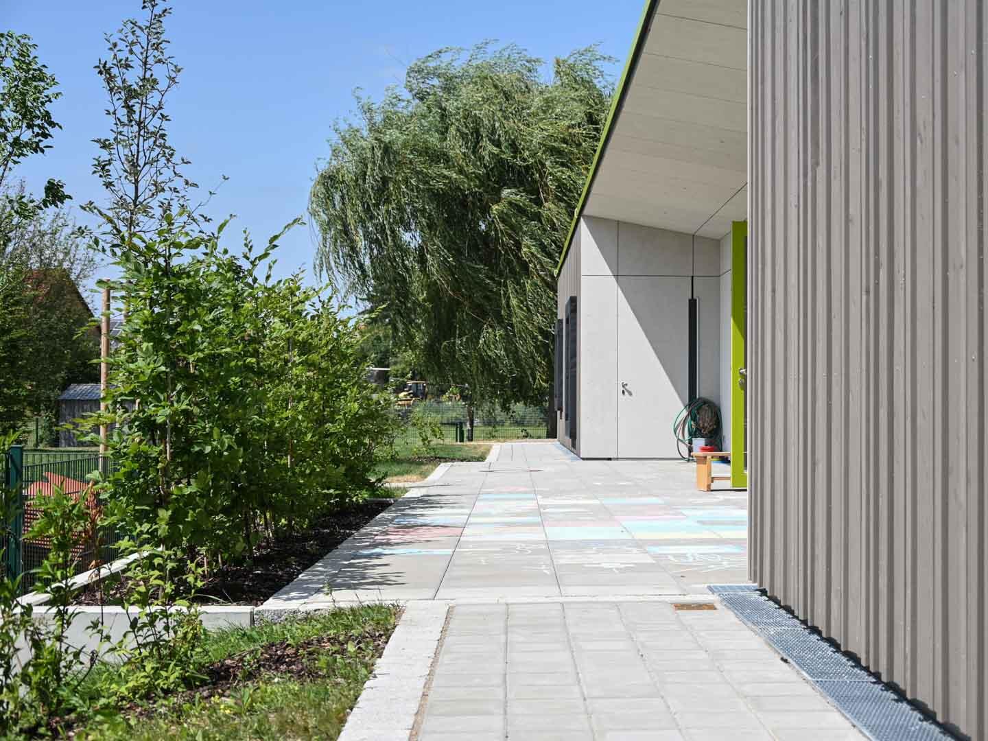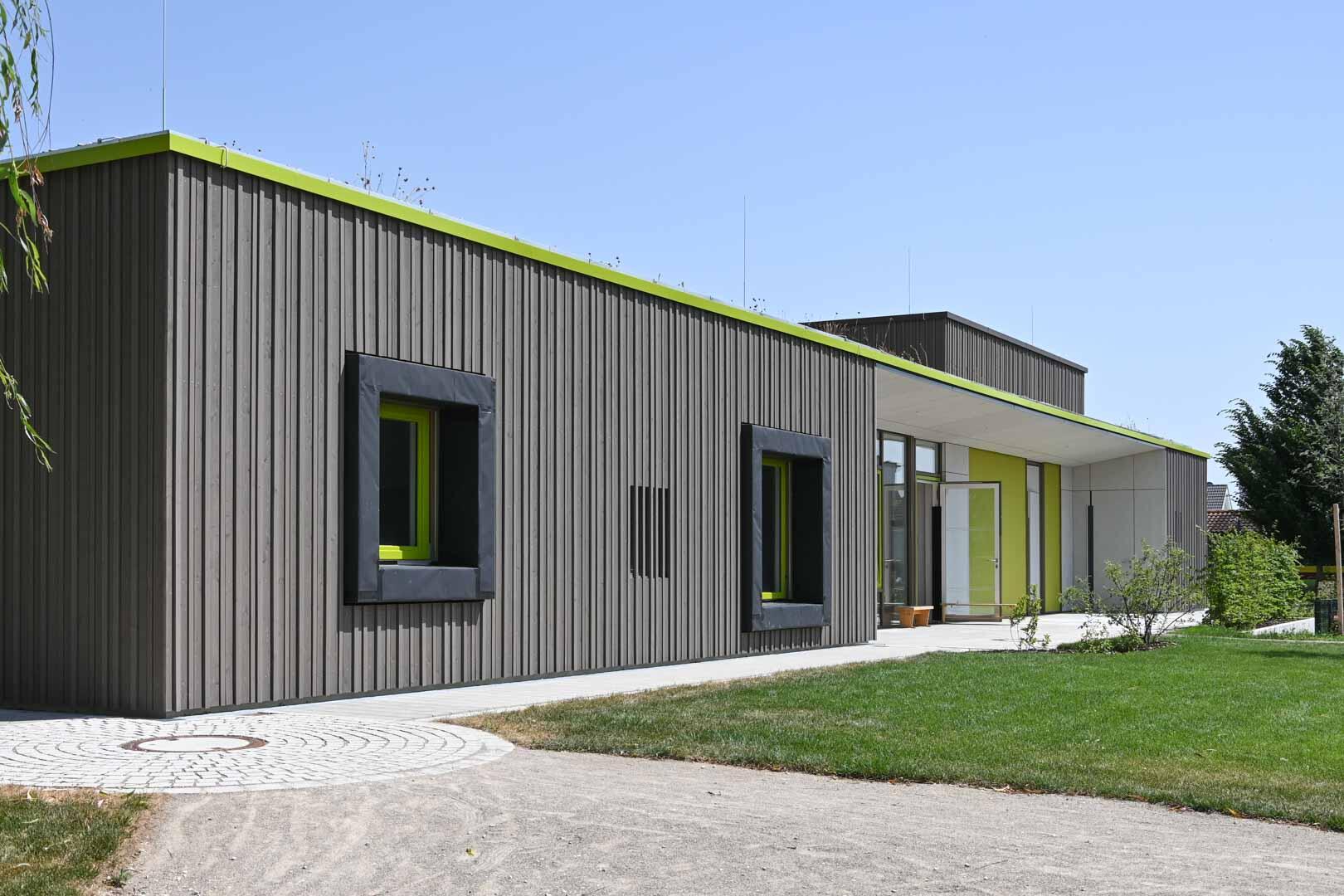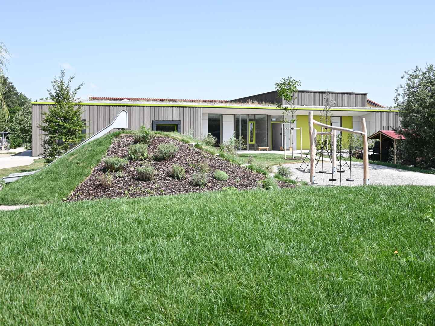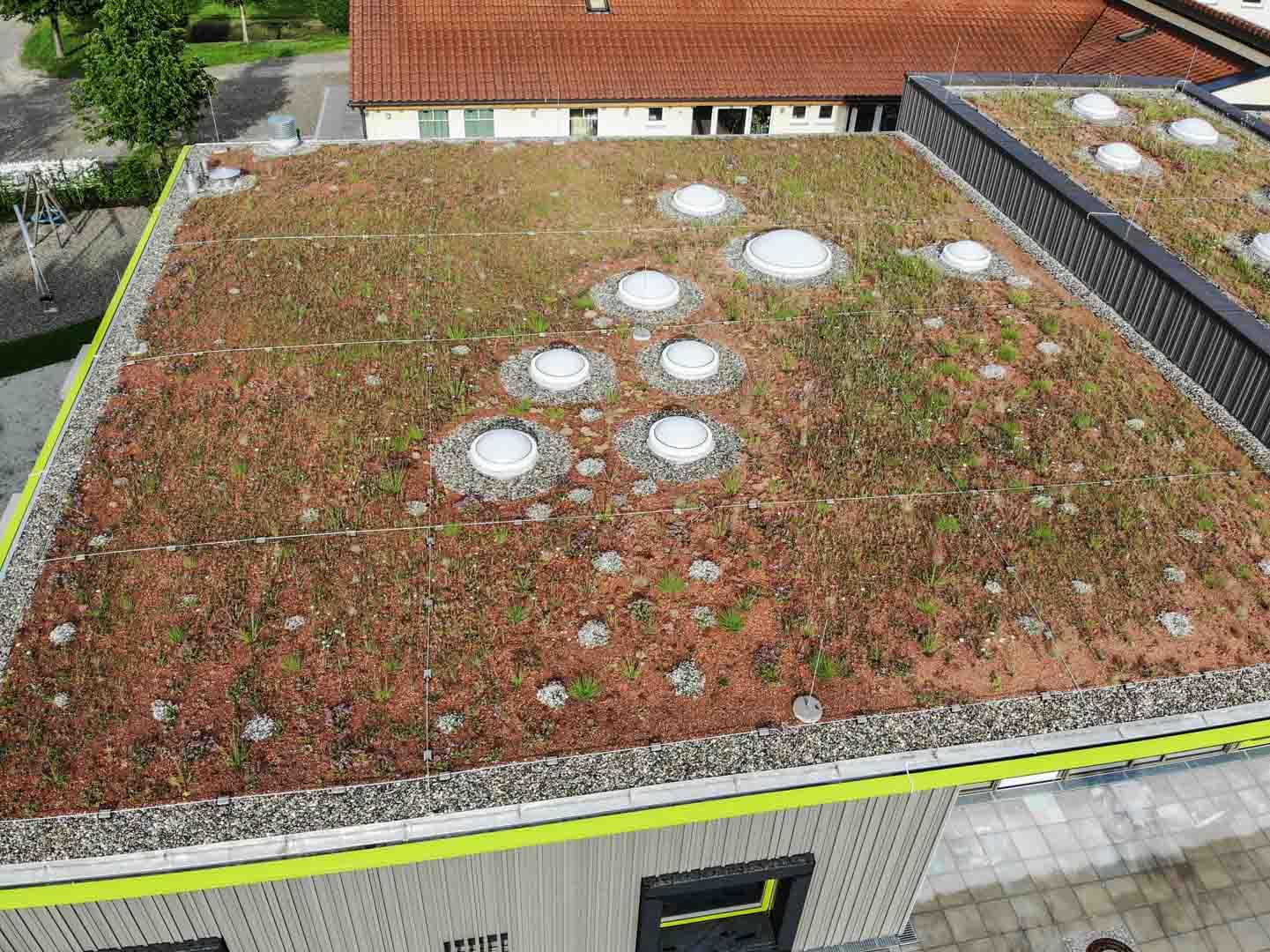Das Dach des Hauses ist begrünt. Die Bepflanzung ist von unten kaum sichtbar. In der Bildfolge zeigen wir Ihnen und euch Bilder aus der Vogelpersektive. Noch besser: Es gibt sogar ein Video vom Haus für Kinder St. Elisabeth von oben.