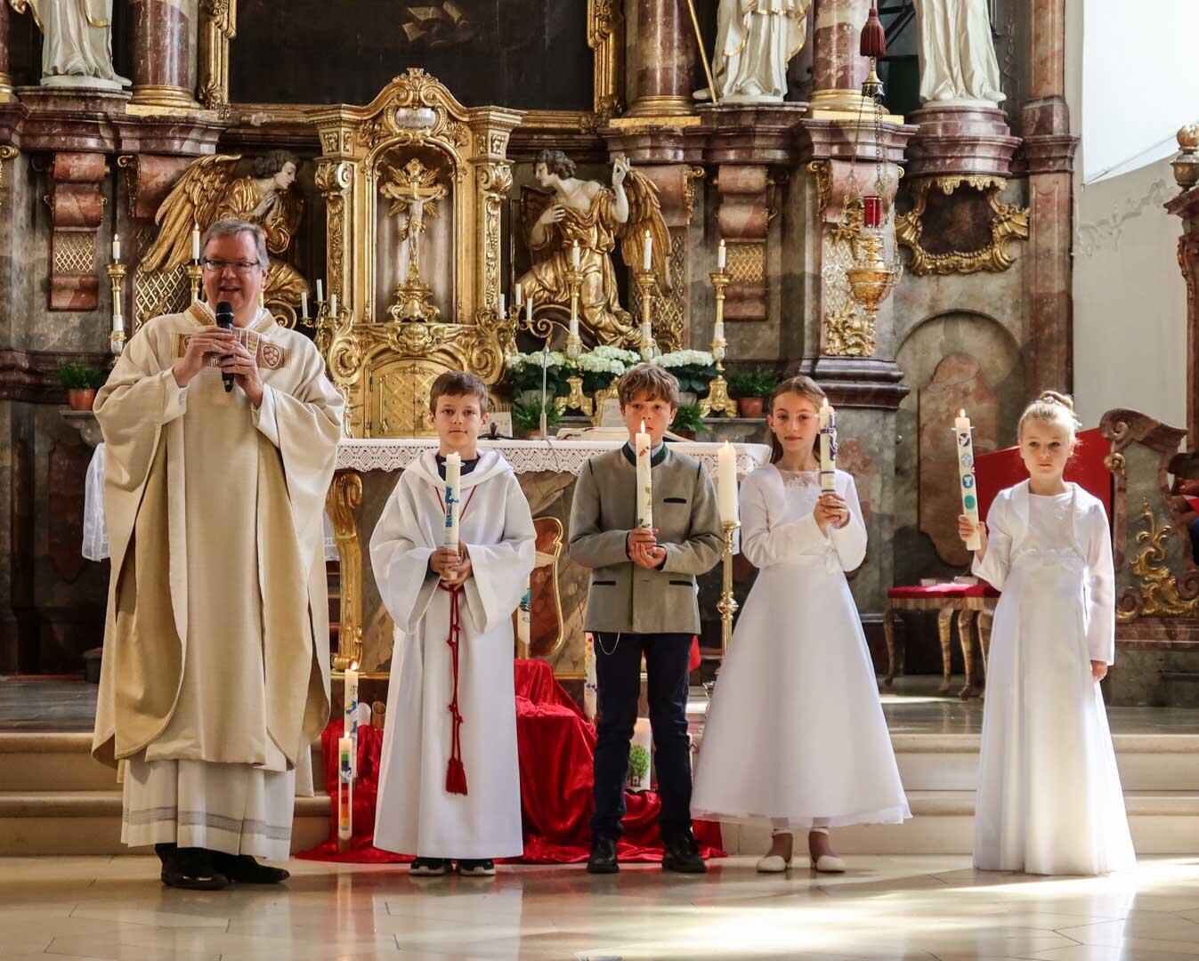 Nachdem sie mit ihren brennenden Kommunionkerzen in die Kirche eingezogen waren, erinnerte Pfarrer Kohler die jungen Christen mit Blick auf die Osterkerze daran, dass sie damit ihre eigene kleine Osterkerze in den Händen hielten. Das Licht der Kerzen sollte ihnen immer bewusstmachen, dass Christus wie ein Licht in uns brennt und dass wir dieses Licht auch weitertragen sollten.