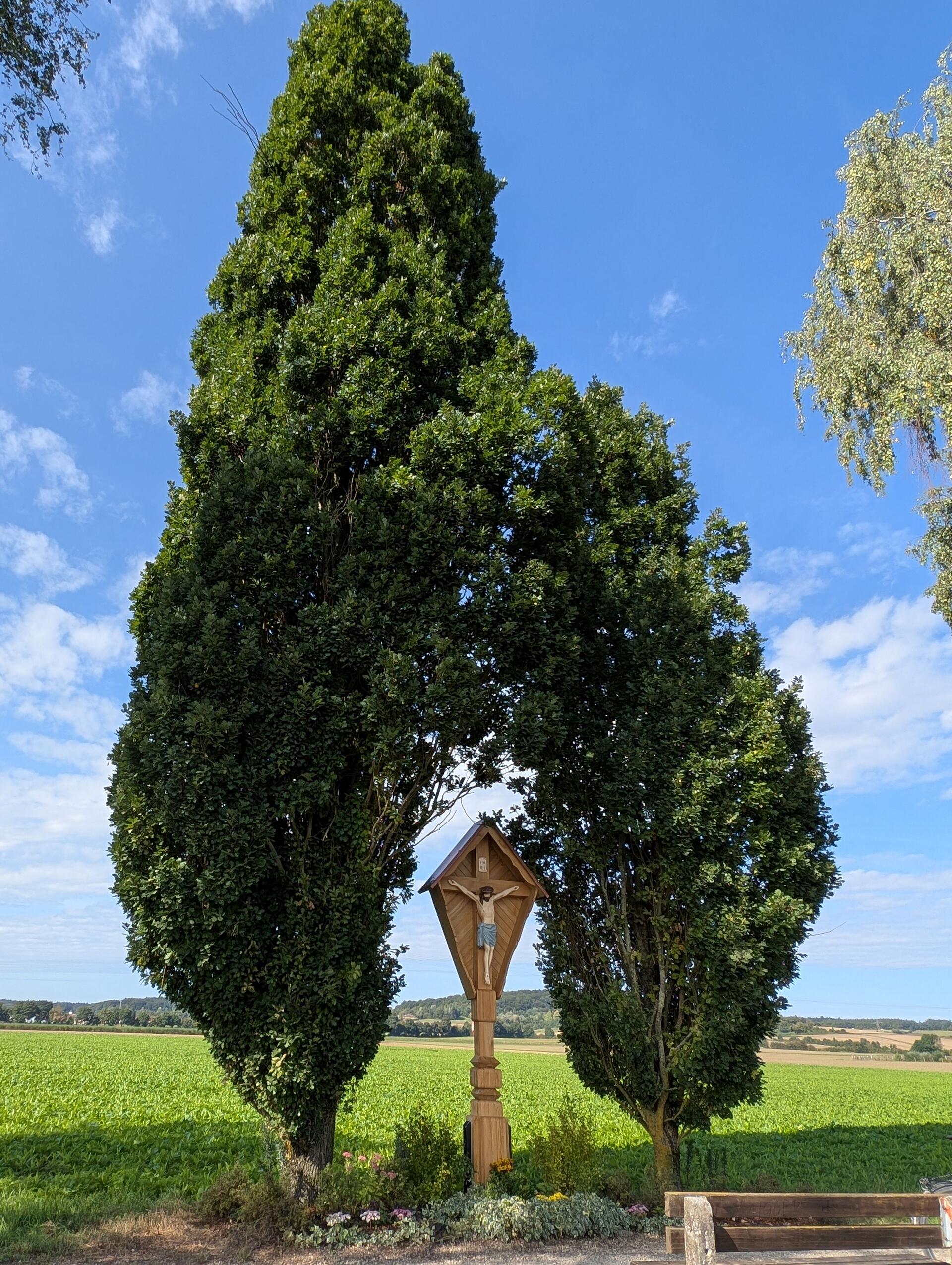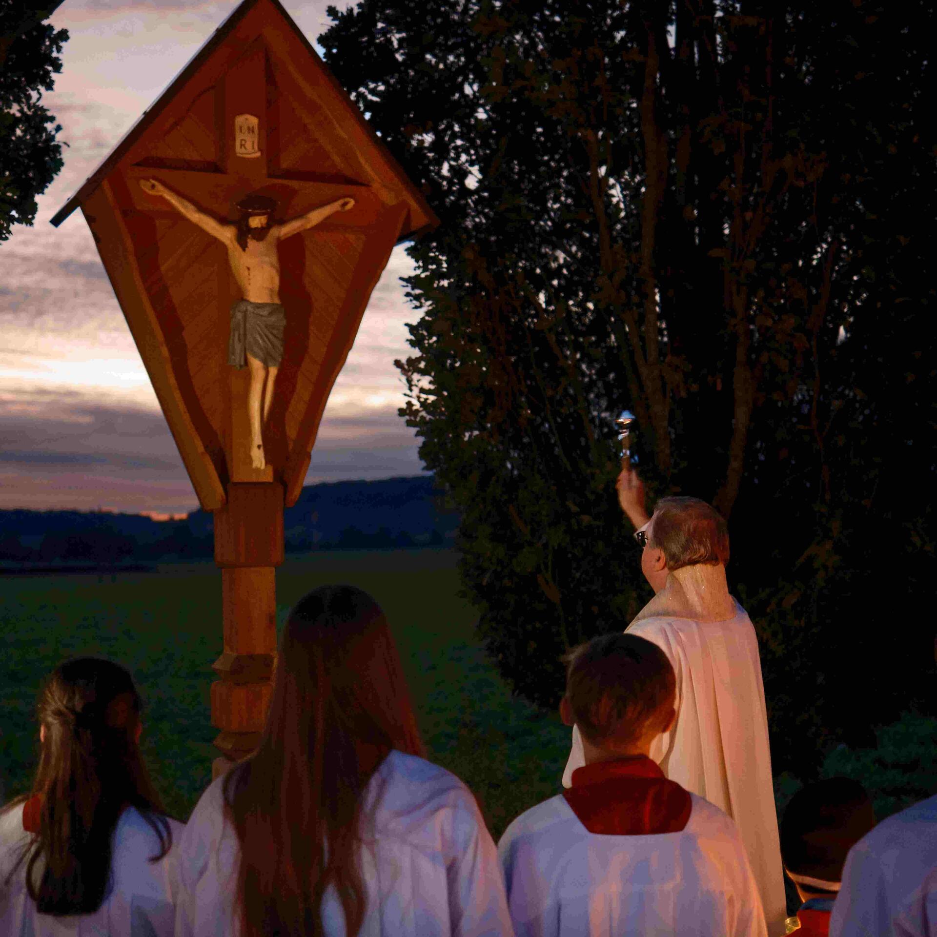 (Christian Richter) Auf dem Wallfahrtsweg von Feldkirchen zum Kahlhof, der gesäumt von Birken ist, war nun schon seit längerer Zeit ein prägnanter Platz frei. Umrahmt von Eichen stand dort nur noch ein kleines Taferl, auf dem mitgeteilt wurde, dass das hier stehende Kreuz gerade restauriert wird. Nach langer Zeit steht jetzt wieder das Kreuz und wurde am Sonntag des Kahlhoffestes im Rahmen des Kahlhoffestes bei der Lichterprozession am Abend eingeweiht. Unter der untergehenden Sonne zogen ab 19.30 Uhr viele Gläubige von der Kapelle Maria im Gnadenfeld zum neu errichtenden Kreuz, wo sie von den Klängen Jagdhornbläser empfangen wurden, die die Segnungsfeier mitgestalteten. Dort versammelten sie sich im Halbkreis vor dem Kreuz nach Westen blickend und bewunderten, wie es von den letzten Sonnenstrahlen des Tages umrahmt wurde. Stadtpfarrer Herbert Kohler erklärte in seinen einleitenden Worten, dass sie sich für die Segnung am Tag des Kahlhoffestes entschieden haben, da am 14. September passenderweise auch das Fest Kreuzerhöhung ist. Dieses Fest erinnert an das Auffinden des Wahren Kreuzes durch die römische Kaiserinmutter Helena im 3. Jahrhundert.