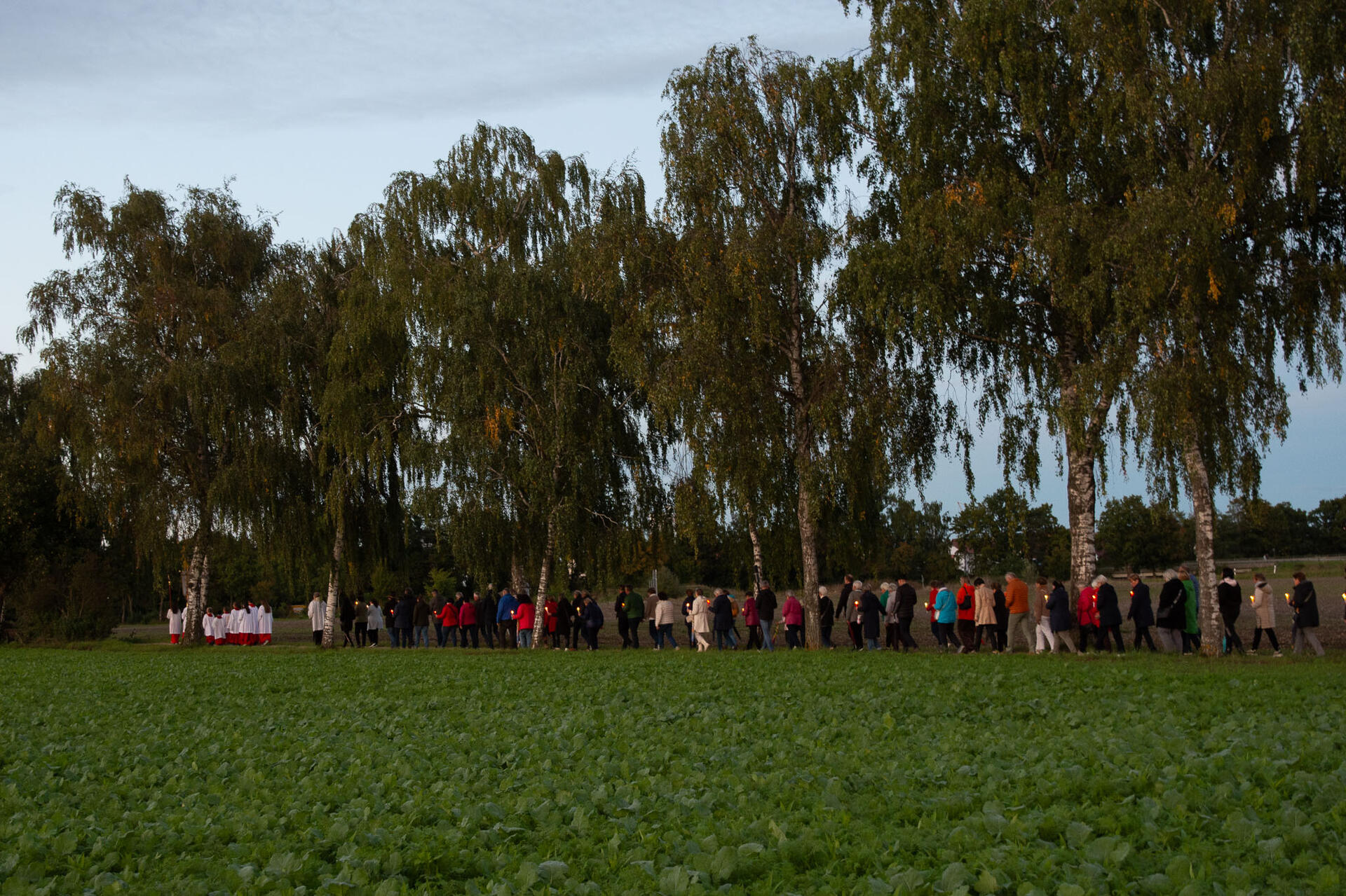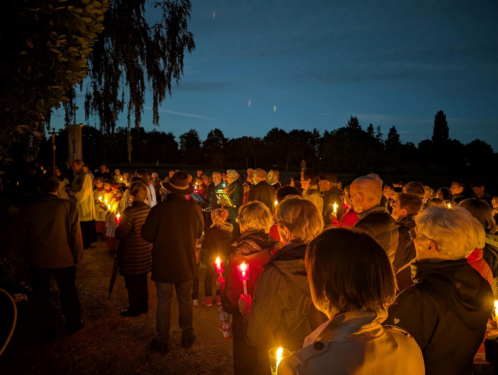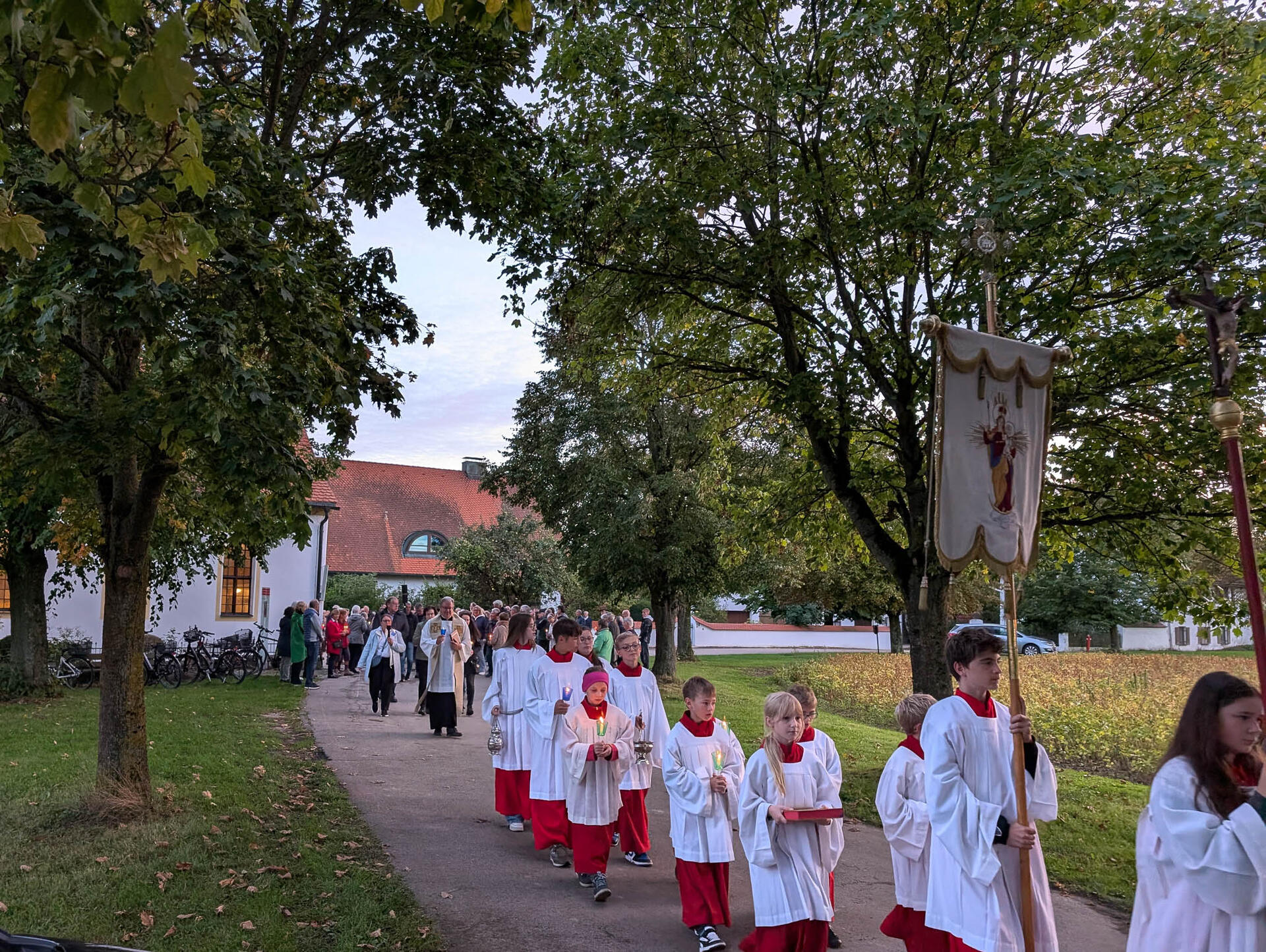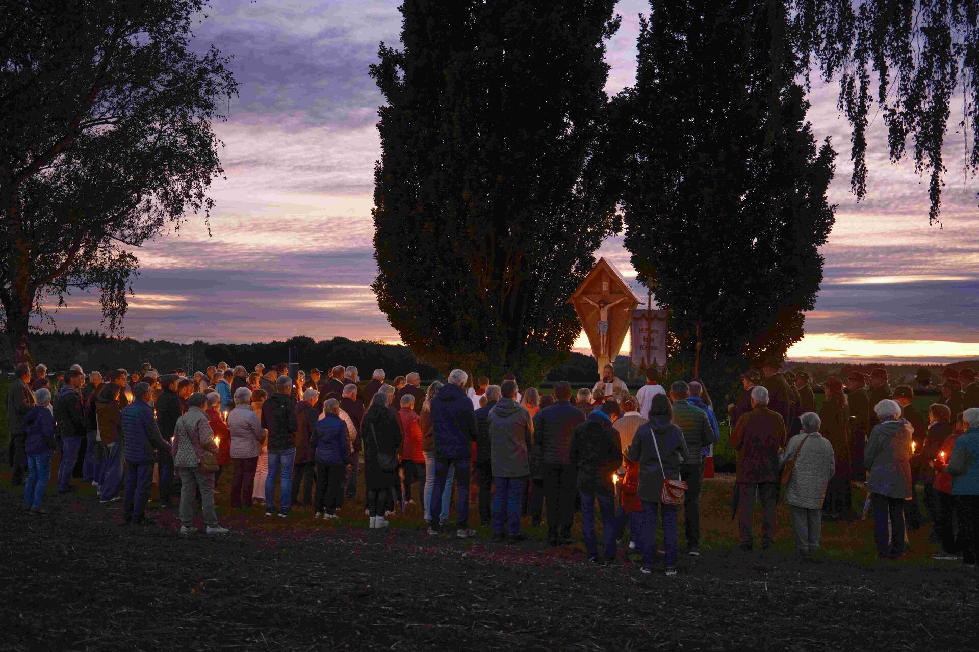 Neben den Jagdhornbläsern gestalteten auch die Weicheringer Dorfsinger die Messe musikalisch mit. Abschließend ergriff dann der Vorsitzende des Verschönerungsvereines, Bernhard Pfahler, das Wort. Der Verschönerungsverein hatte sich federführend um die Restaurierung des Kreuzes gekümmert. Er dankte den vielen Helfern, die sich rund um die Errichtung des Kreuzes eingesetzt hatten, der Schreinerei Kugler für die Arbeiten am Kreuz und den Spendern, durch die bereits ein Teil der Kosten gedeckt werden konnte und hoffte auch noch auf weitere Spenden für die Errichtung des Kreuzes. Zum Schluss zogen die Gläubigen im Kerzenschein wieder zurück zur Kahlhofkapelle, wo es dann an diesem schönen Septemberabend auseinanderging
