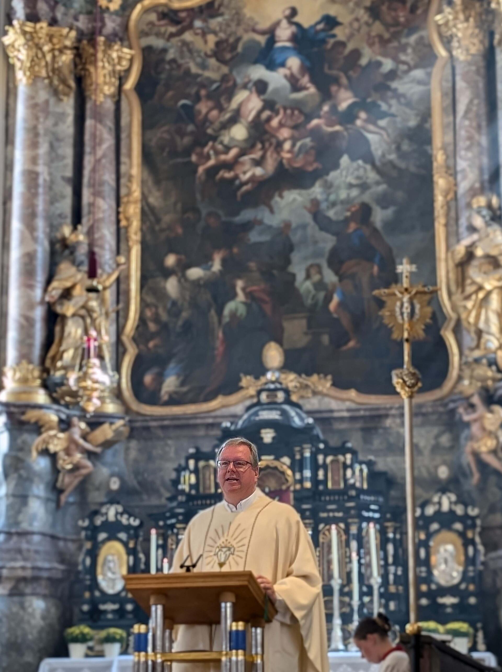 (Christine Jann) In der vollen Hofkirche begrüßte Stadtpfarrer Herbert Kohler die Gläubigen zum Hochfest „Mariä Aufnahme in den Himmel“ und gleichzeitig zum Patrozinium der ehemaligen Jesuitenkirche. Das Altarbild zeige, was uns allen verheißen ist, dass wir alle einst wie Maria mit Leib und Seele in den Himmel zu Gott erhoben werden, erinnerte Kohler gleich zu Beginn an die wesentliche Glaubensbotschaft des Festes.