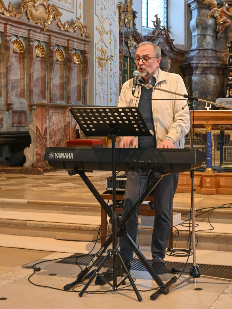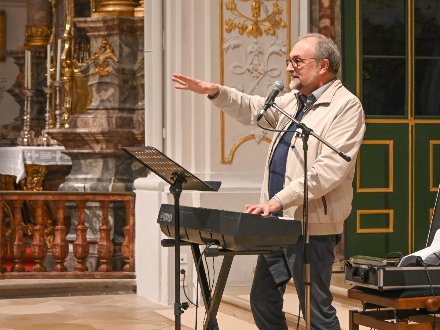 Unter der Überschrift „Mit dem Ohr des Herzens“ gestaltete Pater Norbert Becker, der aus der Oase Steinerskirchen nach Neuburg gekommen war, einen abwechslungsreichen und begeisternden Mix aus Gesang und Predigt. Diesmal nicht eingebunden in eine Vesper wechselte er immer wieder zwischen vorne aufgebauten Piano und Ambo.