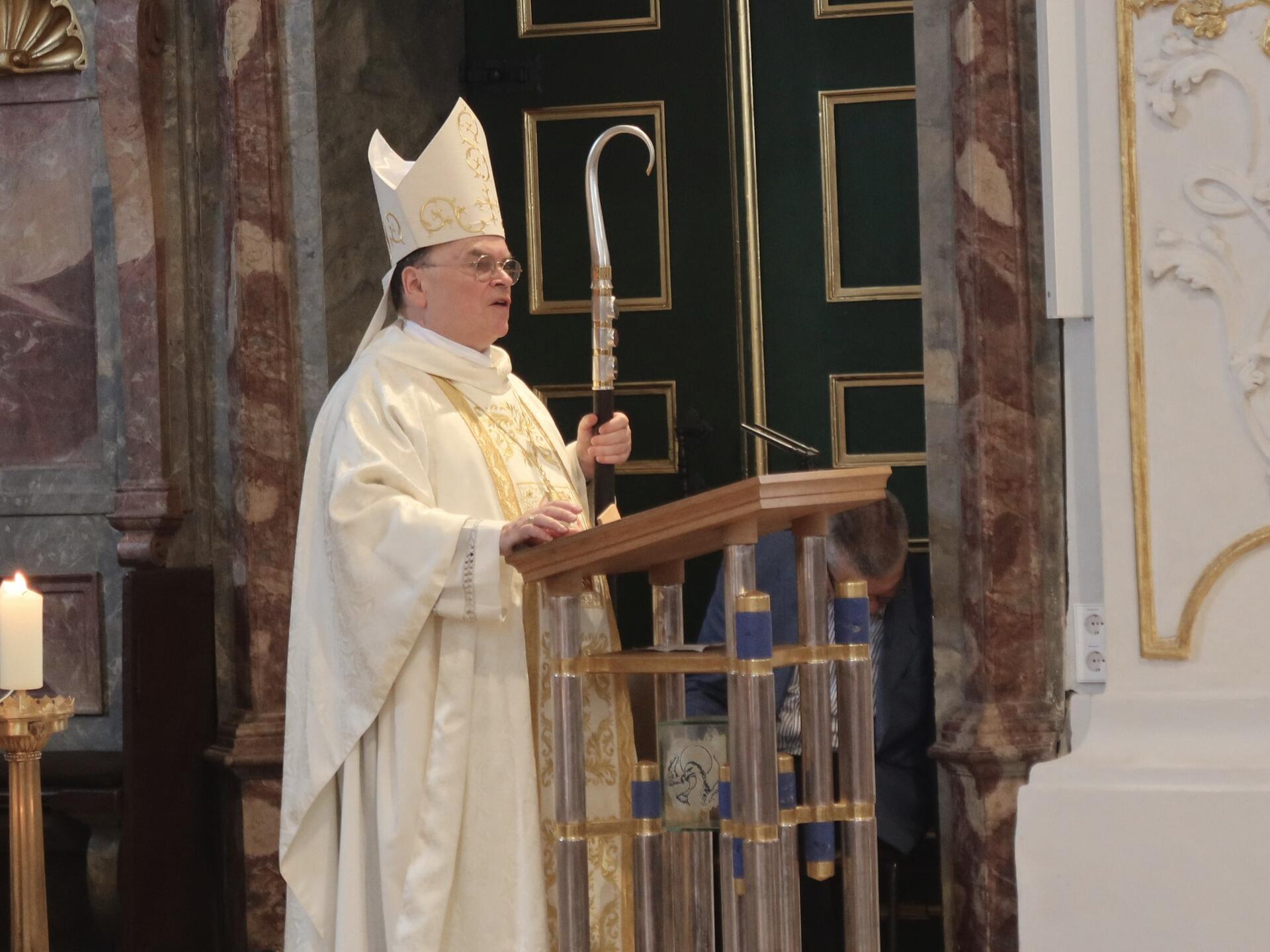 In seiner Ansprache in der voll besetzten Hofkirche sprach der Augsburger Bischof nach dem „Vergelt´s Gott!“ für alle an der Restauration der Orgel Beteiligten eine ganze Bandbreite von Themen an: An erster Stelle die Bedeutung der Kirchenmusik, insbesondere der Pfeifenorgel, die im 2. Vatikanischen Konzil in der Liturgiekonstitution extra hervorgehoben wurde. Hier lobte und dankte der Bischof auch noch einmal den anwesenden Orgelbauern und dem Intonateur für ihre Arbeit, dass mit einem neuen Klangkonzept und neuen Registern die Hofkirche mit ganz neuen Tönen gefüllt würde. Als Sprache jenseits der Sprache sei Musik eine eigene Form der Verkündigung.