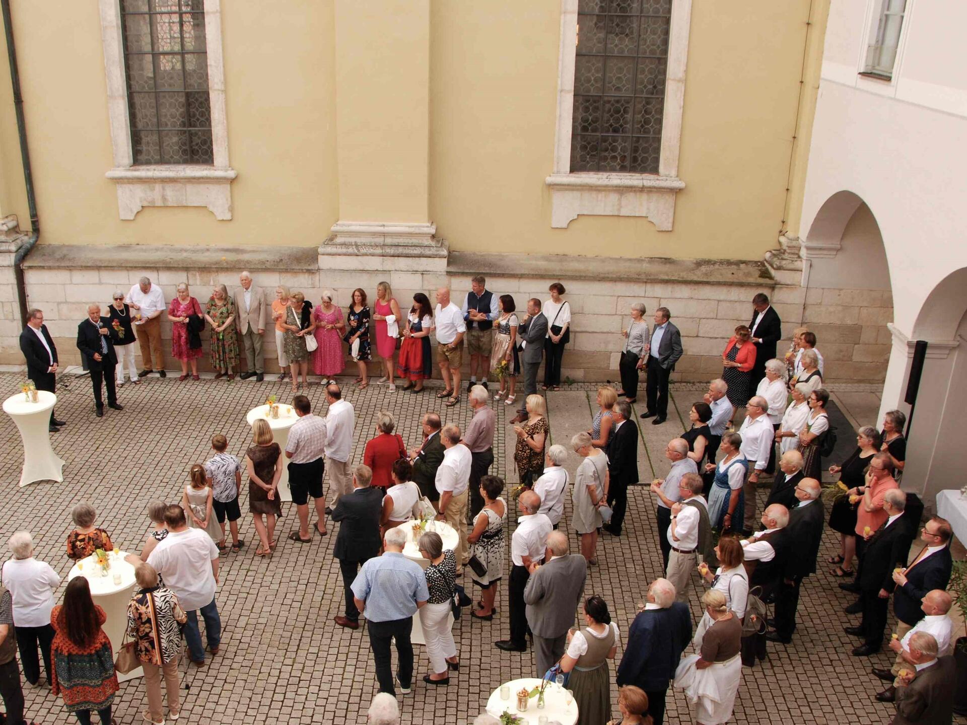 Mit einem Stehempfang vor dem Festgottesdienst im Hof der Maria-Ward-Realschule bedankten sich Stadtpfarrer Kohler als Präfekt der Hofkirche und Alfred Hornung als Administrator bei den vielen Spendern und Orgelpfeifenpaten für die außerordentliche Unterstützung, ohne die die Restaurierung überhaupt nicht möglich gewesen wäre. Bei dieser Gelegenheit kündigt Dr. Margit Vonhof-Habermeyr als neues Mitglied des Hofkirchenrates an, den Förderverein „Freunde der Hofkirche“ wieder neu beleben zu wollen. Dessen Mittel hatten die Finanzierung zum größten Teil getragen.