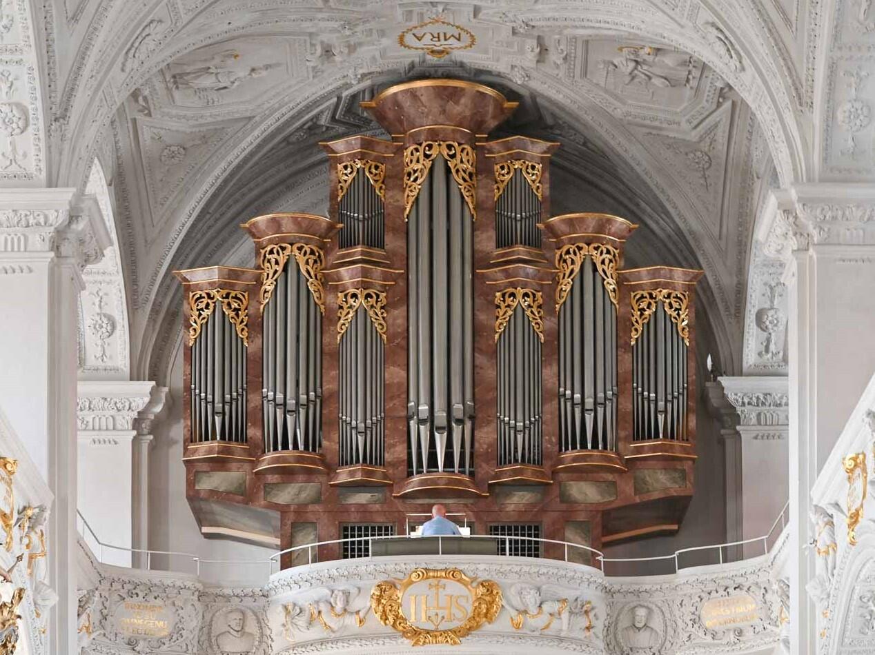 Aus Augsburg war auch der Leiter des Amtes für Kirchenmusik und ausgewiesene Orgelspezialist Pater Stefan Kling angereist. Ihm war es vorbehalten, die neu restaurierte Orgel zum ersten Mal vor Publikum erklingen zu lassen – aber erst nachdem der Bischof die Stufen zur Empore erklommen und die Orgel geweiht hatte. Zusammen mit dem Kirchenchor St. Peter und dem Orchester unter der Leitung von Max Höringer und dem Bläserensemble unter Leitung von Josef Kretzmann sorgte der Prämonstratenser am Orgeltisch für ein ganz besonderes und dem Anlass würdiges Musikerlebnis bei diesem Festgottesdienst.