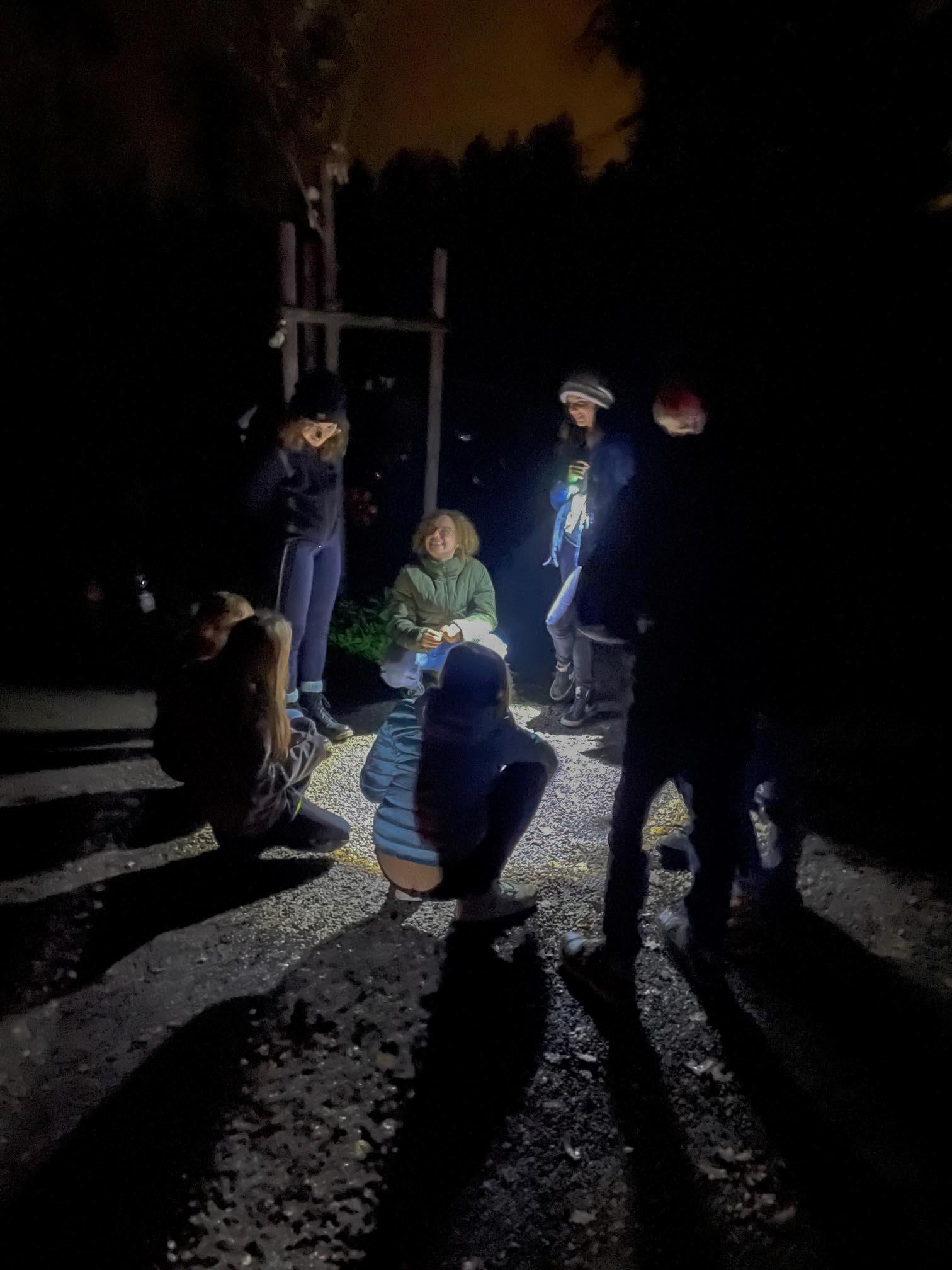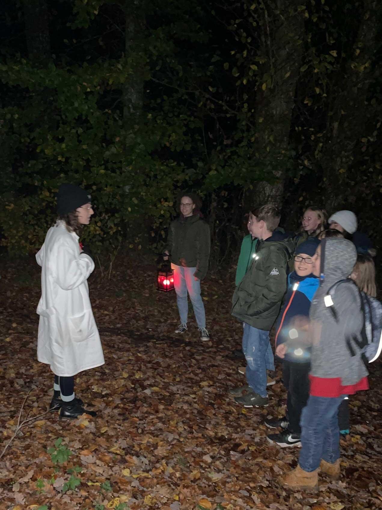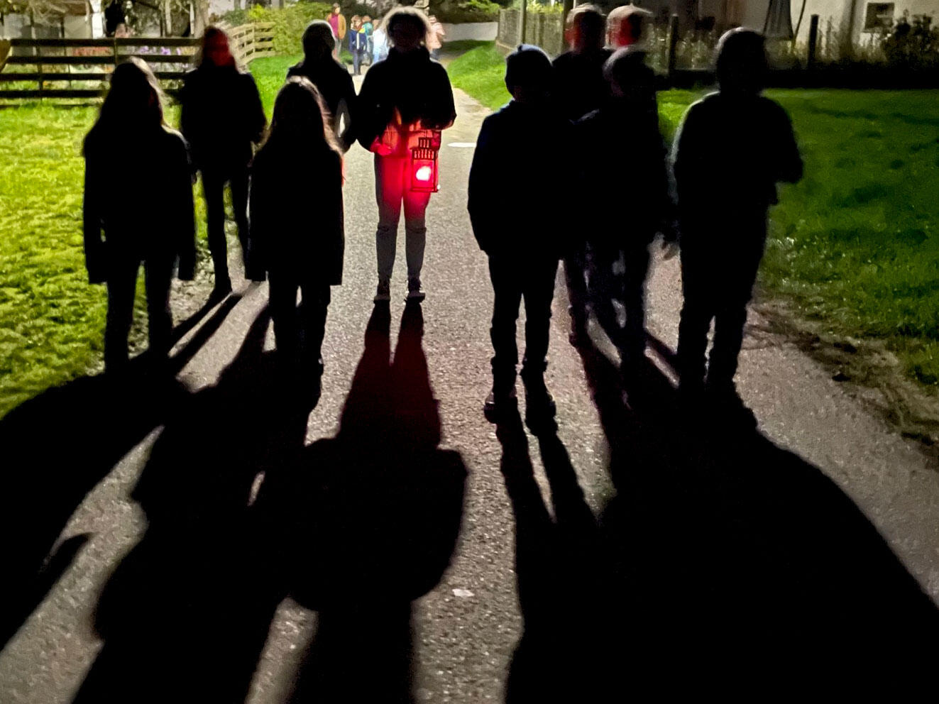 Wir sind in stockdunkler Nacht durch den stockdunklen Wald von Bergen nach Gietlhausen gewandert. Nein, wir sind geschlichen, mucksmäuschenstill. Und trotzdem haben sie uns gefunden, die gruseligen Monster und Geisterer.