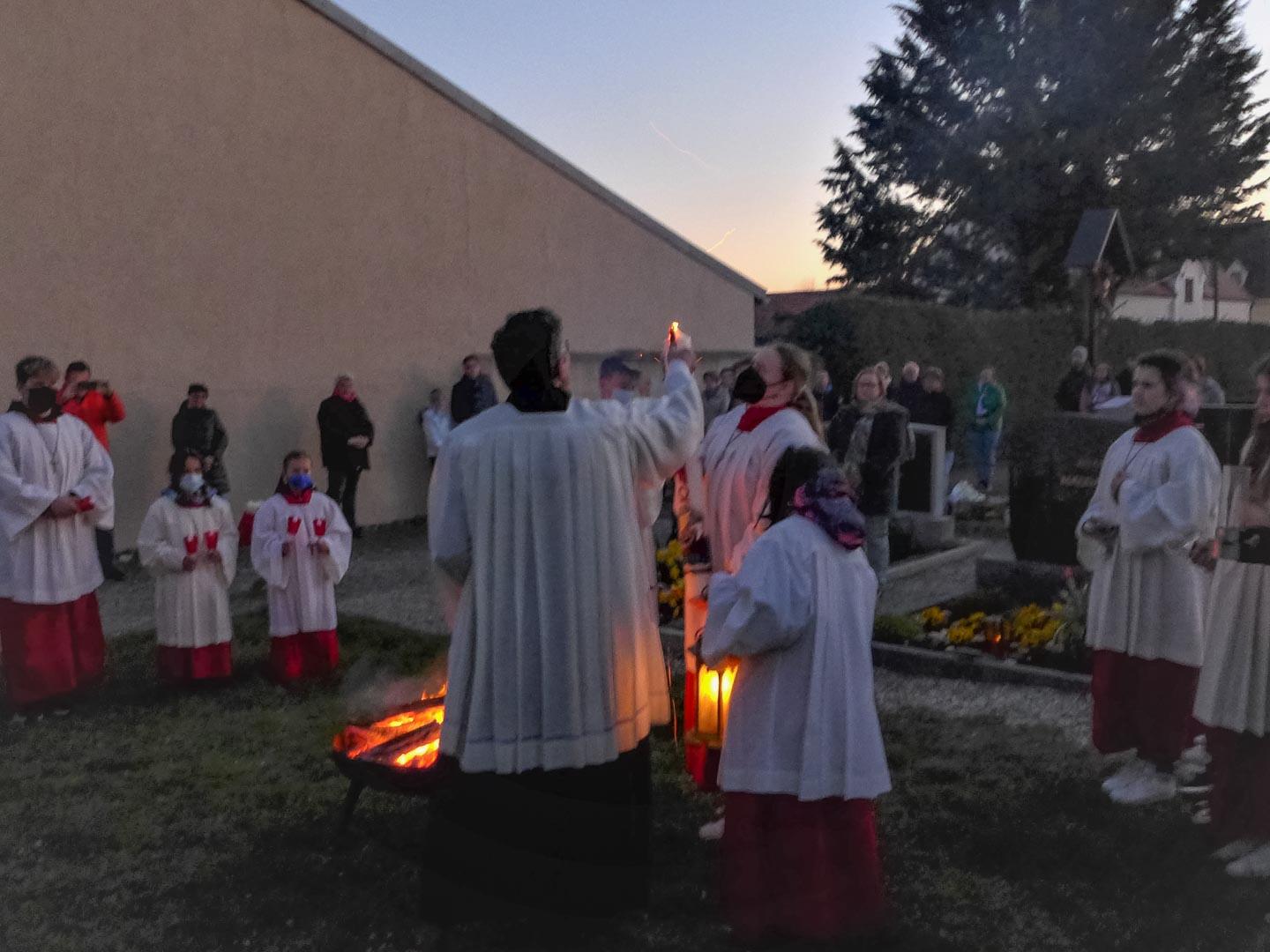 Gemeindereferentin Anne Strahl segnete das Osterfeuer und entzündete die Osterkerze. Es folgte der dreimalige Ruf „Lumen Christi“ und das Licht der Osterkerze wurde an die Gläubigen weiter verteilt.