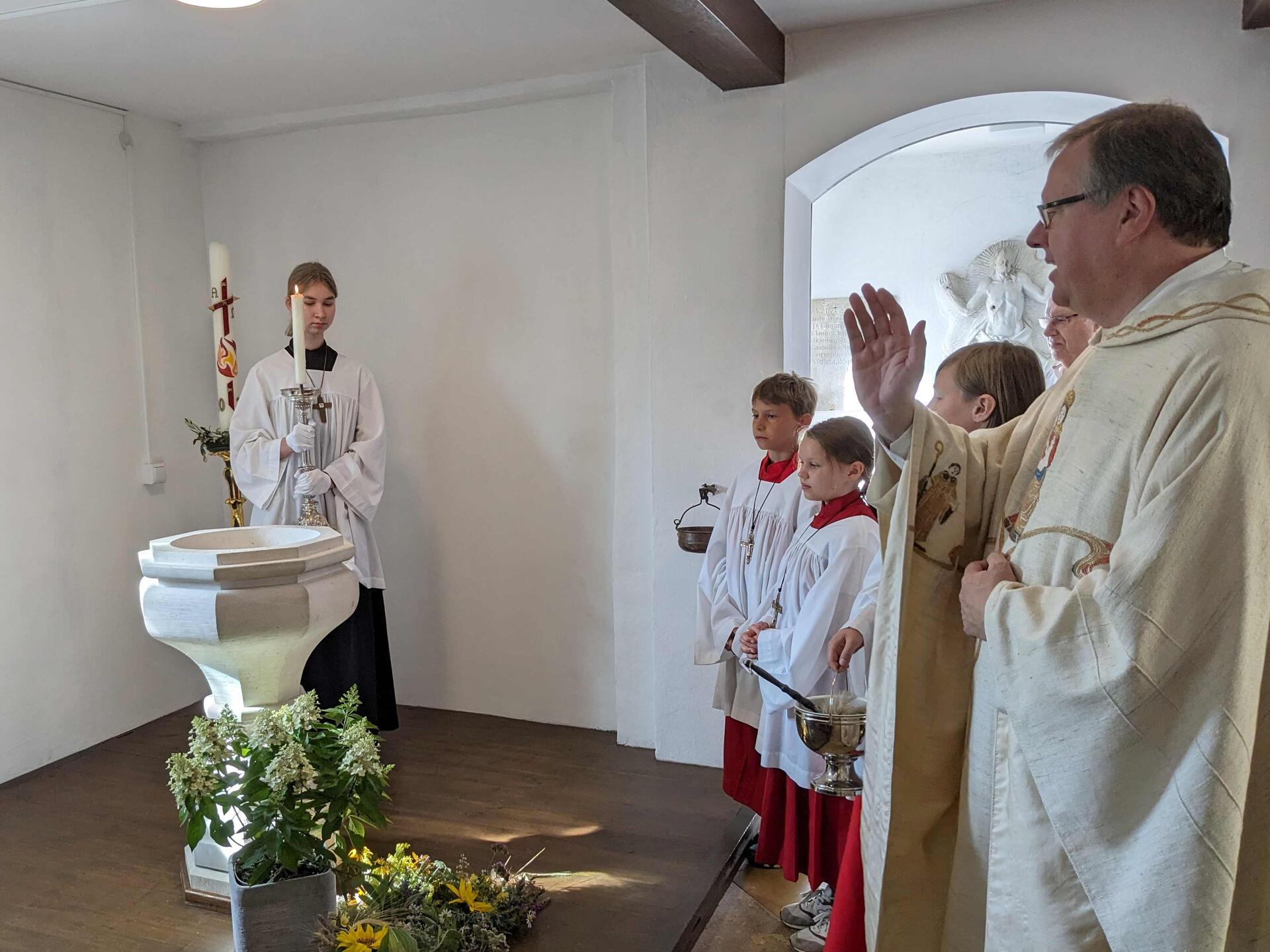 In diesem Jahr nutzte Pfarrer Kohler den Gottesdienst, um auch das sanierte Taufbecken an seinem neuen Standort einzuweihen. Der alte Beichstuhl hatte Platz gemacht und so konnte das Taufbecken aus der verborgenen Ecke im Altarraum an den Eingang der Kirche rücken, an eine vom Licht hell durchflutete Stelle. Der Pfarrer freute sich, dass die Baumaßnahmen soweit fortgeschritten waren, dass die Einweihung am Patrozinium stattfinden konnte - auch wenn noch nicht alles ganz fertig sei.